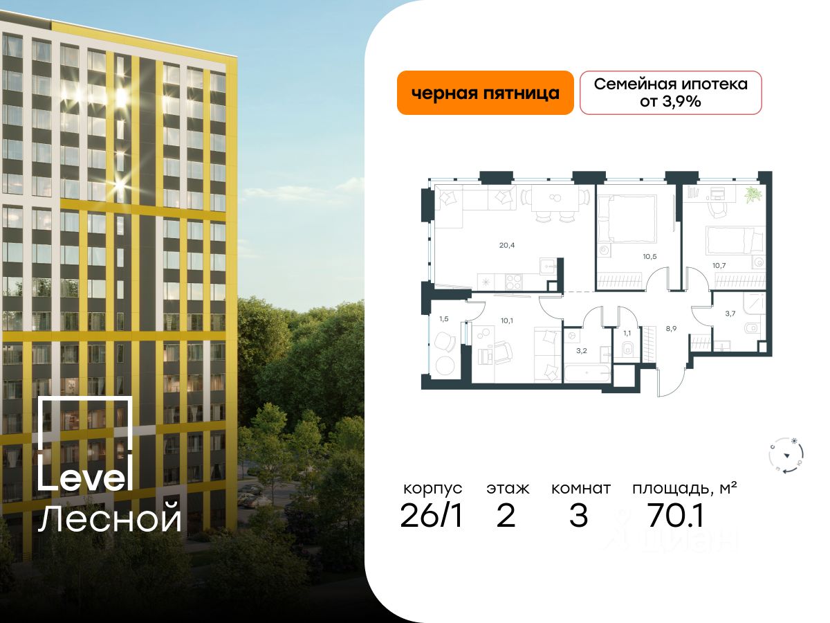 В районе, утопающем в густой зелени лесов, многочисленных парков и скверов, продаётся 3-комнатная квартира площадью 70.10 кв.м с отделкой white box. Квартира расположена на 2 этаже в жилом комплексе комфорт-класса Level Лесной (компания Level Group/Левел групп).