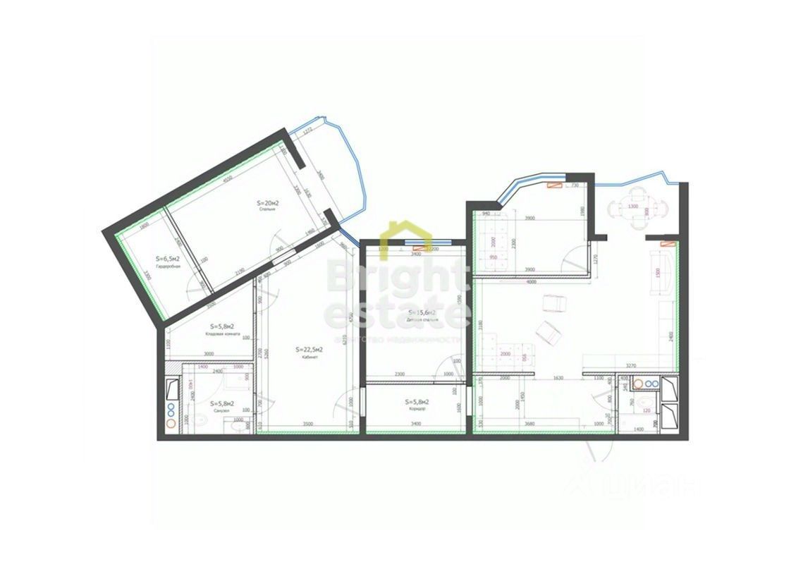 Кухня-гостиная, две спальни, кабинет, гардеробная, кладовая, два санузла и две утепленные лоджии.