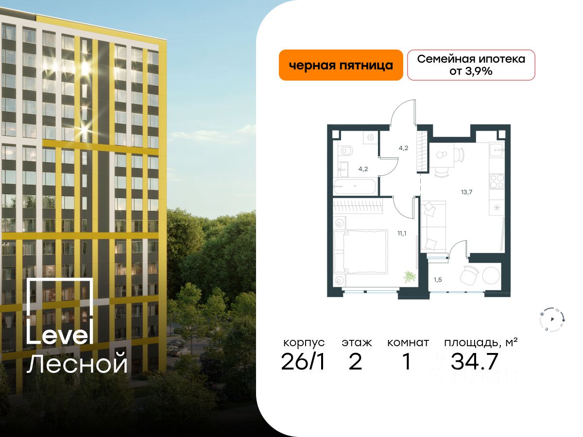 В районе, утопающем в густой зелени лесов, многочисленных парков и скверов, продаётся 1-комнатная квартира площадью 34.70 кв.м с отделкой white box. Квартира расположена на 2 этаже в жилом комплексе комфорт-класса Level Лесной (компания Level Group/Левел групп).