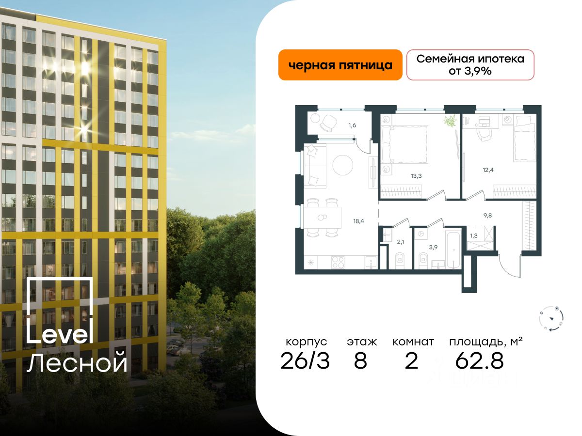 В районе, утопающем в густой зелени лесов, многочисленных парков и скверов, продаётся 2-комнатная квартира площадью 62.80 кв.м без отделки. Квартира расположена на 8 этаже в жилом комплексе комфорт-класса Level Лесной (компания Level Group/Левел групп).
