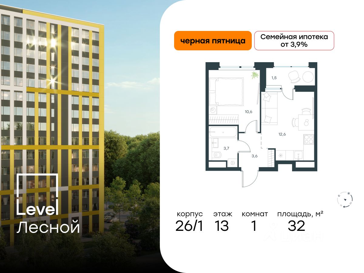 В районе, утопающем в густой зелени лесов, многочисленных парков и скверов, продаётся 1-комнатная квартира площадью 32.00 кв.м с отделкой white box. Квартира расположена на 13 этаже в жилом комплексе комфорт-класса Level Лесной (компания Level Group/Левел групп).