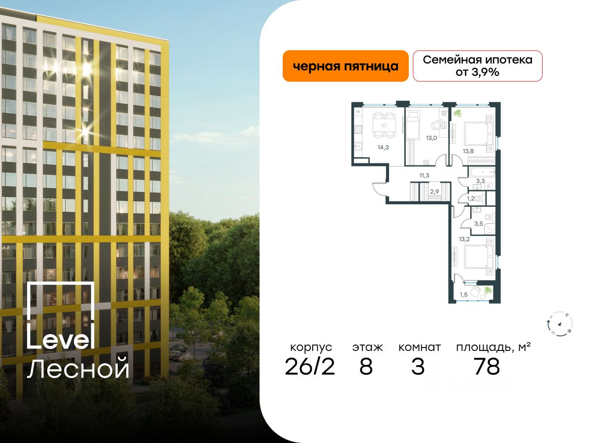 В районе, утопающем в густой зелени лесов, многочисленных парков и скверов, продаётся 3-комнатная квартира площадью 78.00 кв.м без отделки. Квартира расположена на 8 этаже в жилом комплексе комфорт-класса Level Лесной (компания Level Group/Левел групп).