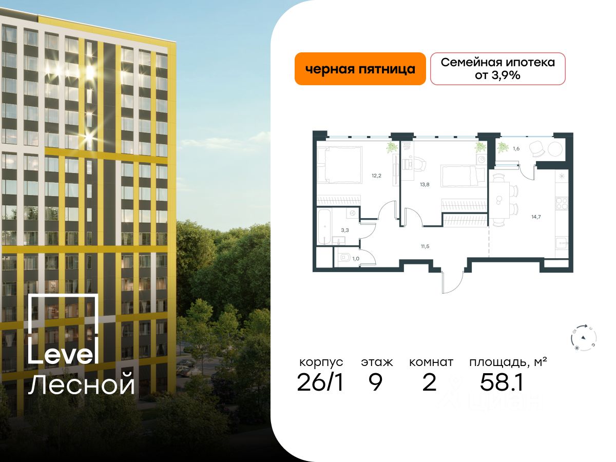 В районе, утопающем в густой зелени лесов, многочисленных парков и скверов, продаётся 2-комнатная квартира площадью 58.10 кв.м с отделкой white box. Квартира расположена на 9 этаже в жилом комплексе комфорт-класса Level Лесной (компания Level Group/Левел групп).