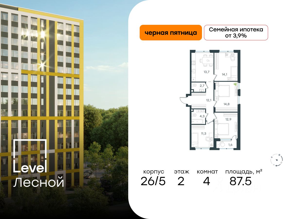 В районе, утопающем в густой зелени лесов, многочисленных парков и скверов, продаётся 4-комнатная квартира площадью 87.50 кв.м с отделкой white box. Квартира расположена на 2 этаже в жилом комплексе комфорт-класса Level Лесной (компания Level Group/Левел групп).