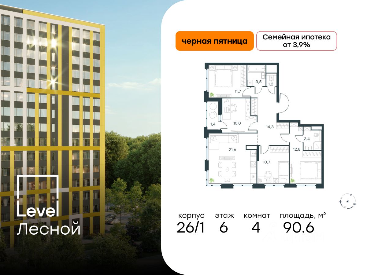 В районе, утопающем в густой зелени лесов, многочисленных парков и скверов, продаётся 4-комнатная квартира площадью 90.60 кв.м с отделкой white box. Квартира расположена на 6 этаже в жилом комплексе комфорт-класса Level Лесной (компания Level Group/Левел групп).