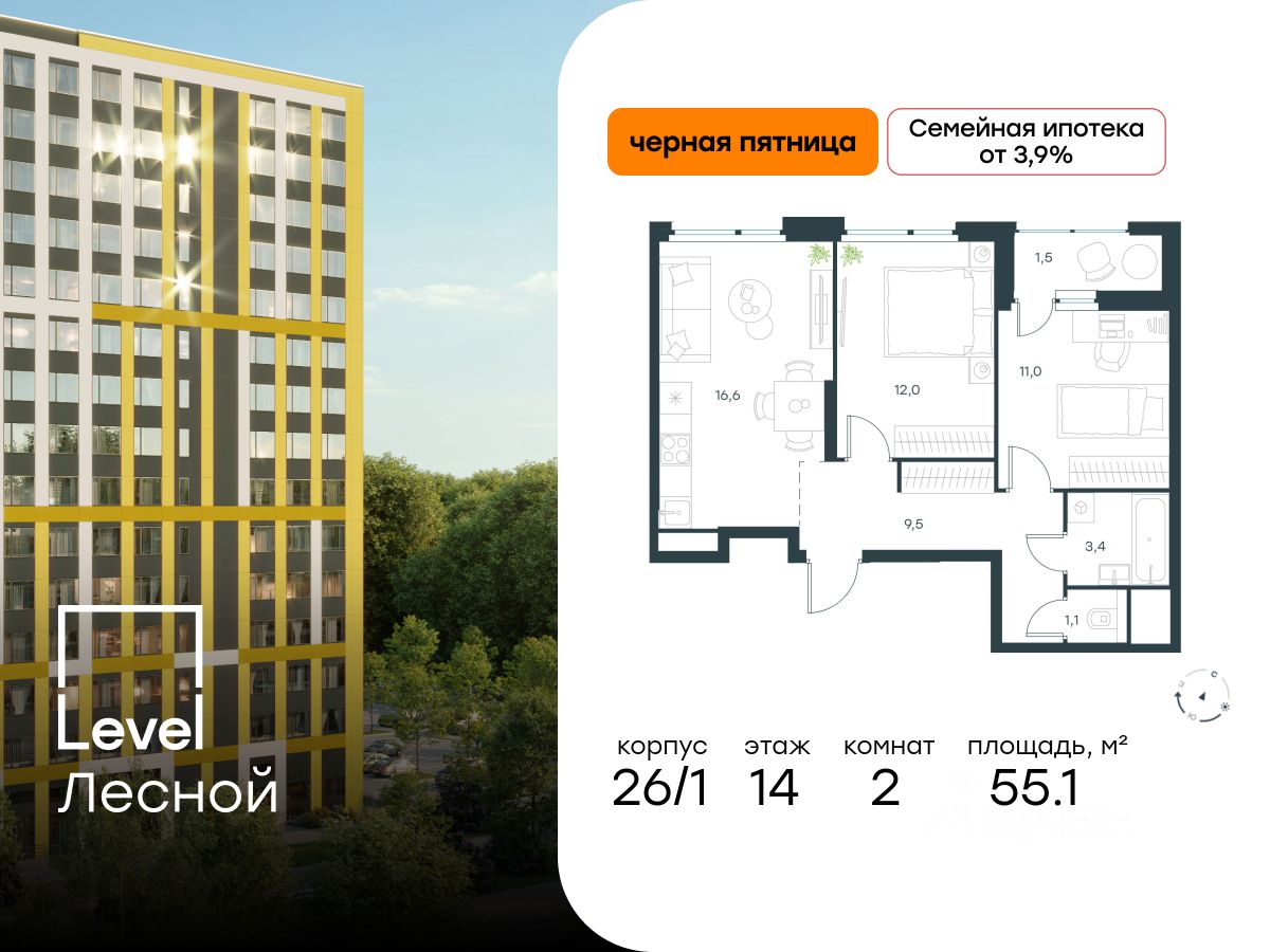 В районе, утопающем в густой зелени лесов, многочисленных парков и скверов, продаётся 2-комнатная квартира площадью 55.10 кв.м с отделкой white box. Квартира расположена на 14 этаже в жилом комплексе комфорт-класса Level Лесной (компания Level Group/Левел групп).