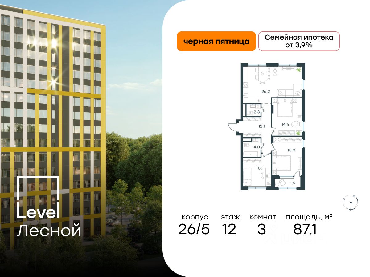 В районе, утопающем в густой зелени лесов, многочисленных парков и скверов, продаётся 3-комнатная квартира площадью 87.10 кв.м с отделкой white box. Квартира расположена на 12 этаже в жилом комплексе комфорт-класса Level Лесной (компания Level Group/Левел групп).