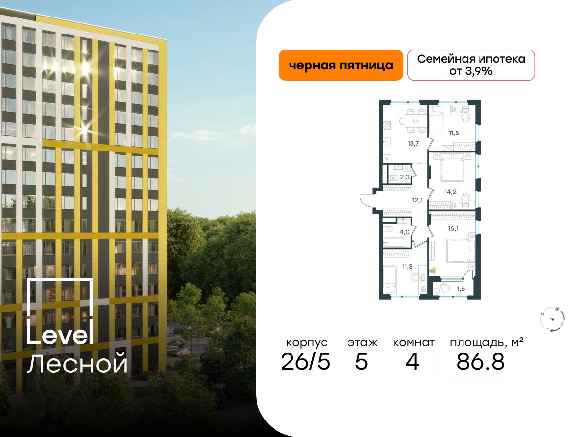 В районе, утопающем в густой зелени лесов, многочисленных парков и скверов, продаётся 4-комнатная квартира площадью 86.80 кв.м с отделкой white box. Квартира расположена на 5 этаже в жилом комплексе комфорт-класса Level Лесной (компания Level Group/Левел групп).
