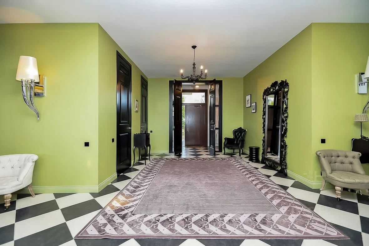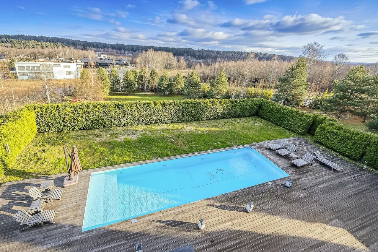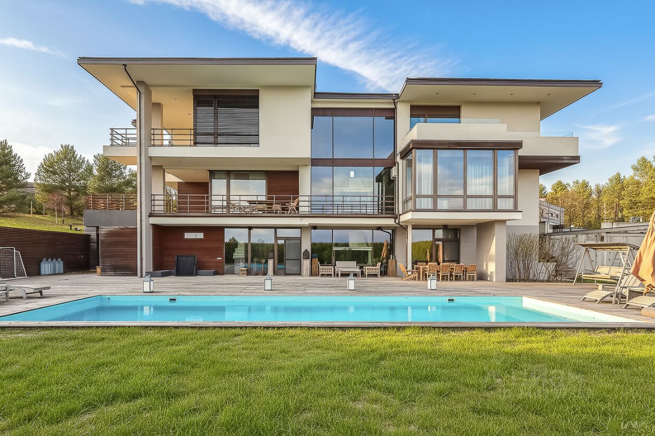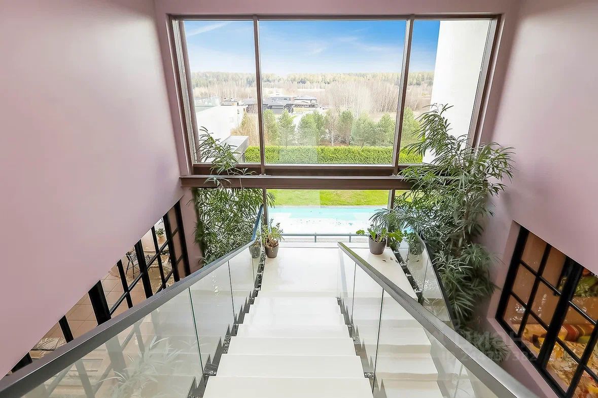 Есть открытый бассейн, площадка для детей, пруд для рыбок, грядки для души. Общая площадь дома 832 кв.м включает в себя цоколь со SPA-зоной, массажный кабинет, блок для персонала, спортзал.