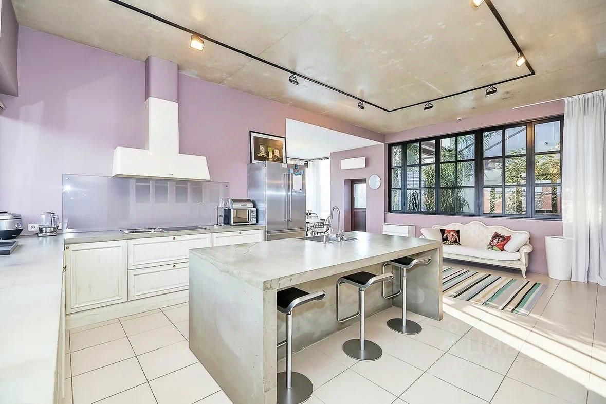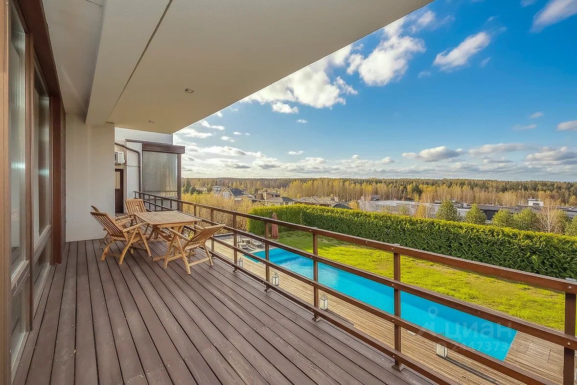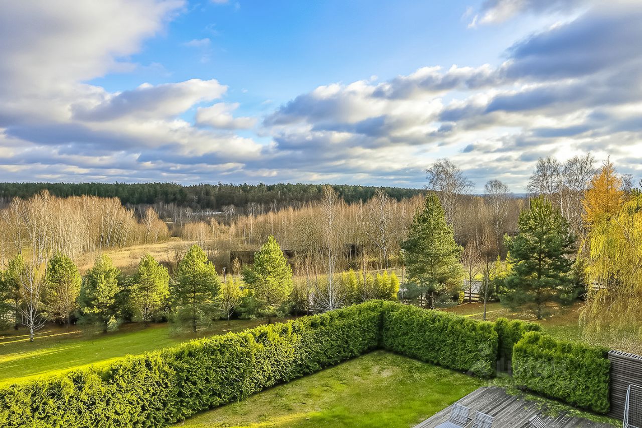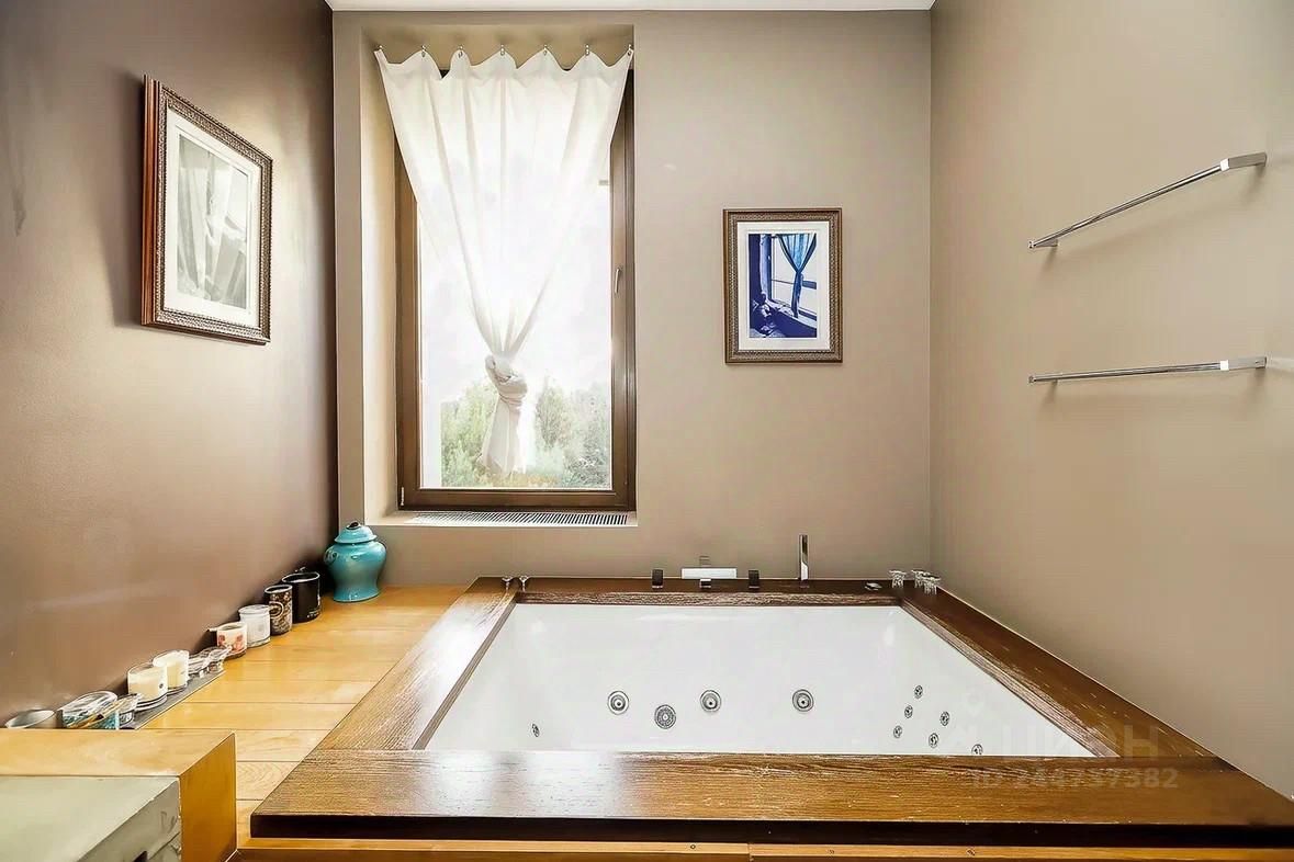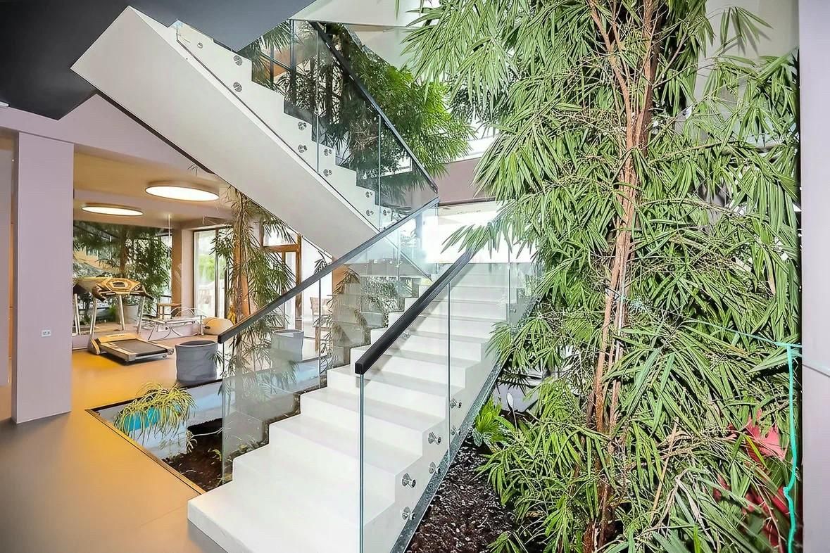 Есть открытый бассейн, площадка для детей, пруд для рыбок, грядки для души. Общая площадь дома 832 кв.м включает в себя цоколь со SPA-зоной, массажный кабинет, блок для персонала, спортзал.