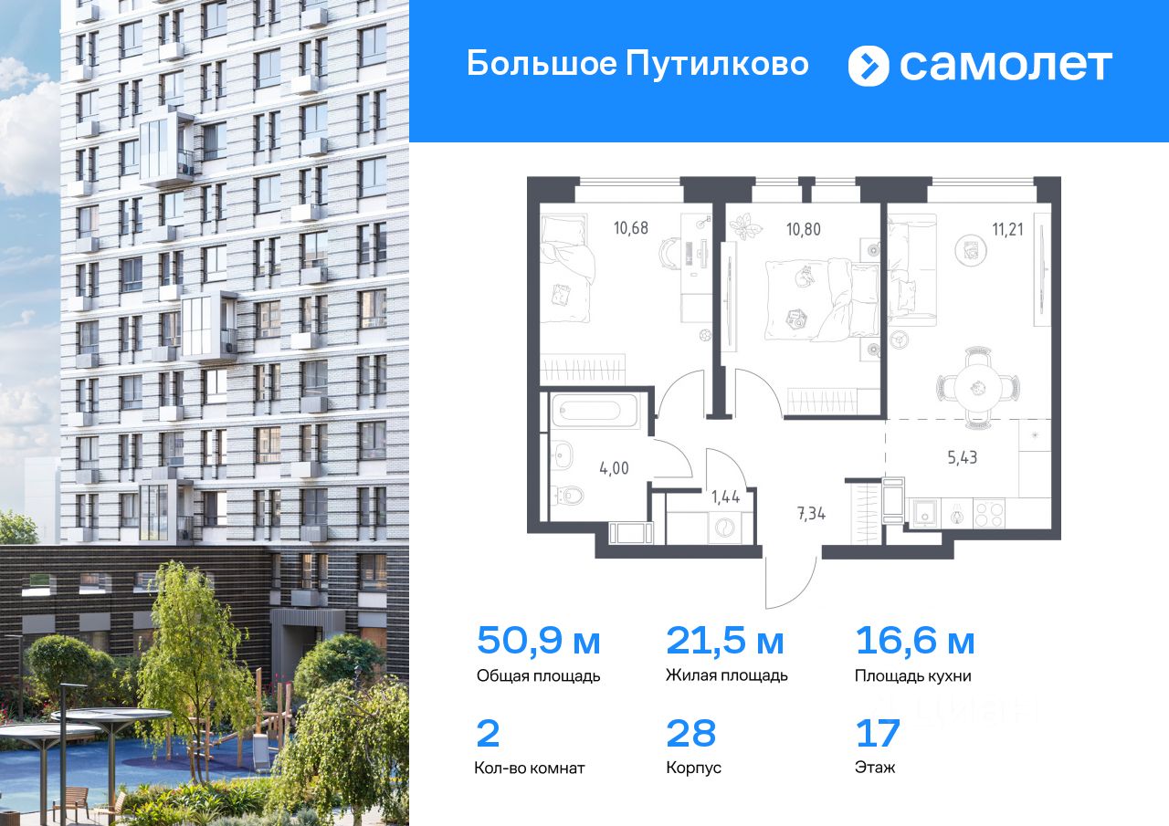 Предлагается 2-комнатная квартира комфорт-класса 50,9 кв.м в корпусе 28 на 17 этаже, в ЖК ''Большое Путилково'' Квартира с чистовой отделкой. Доступность дополнительных опций уточняйте у застройщика.