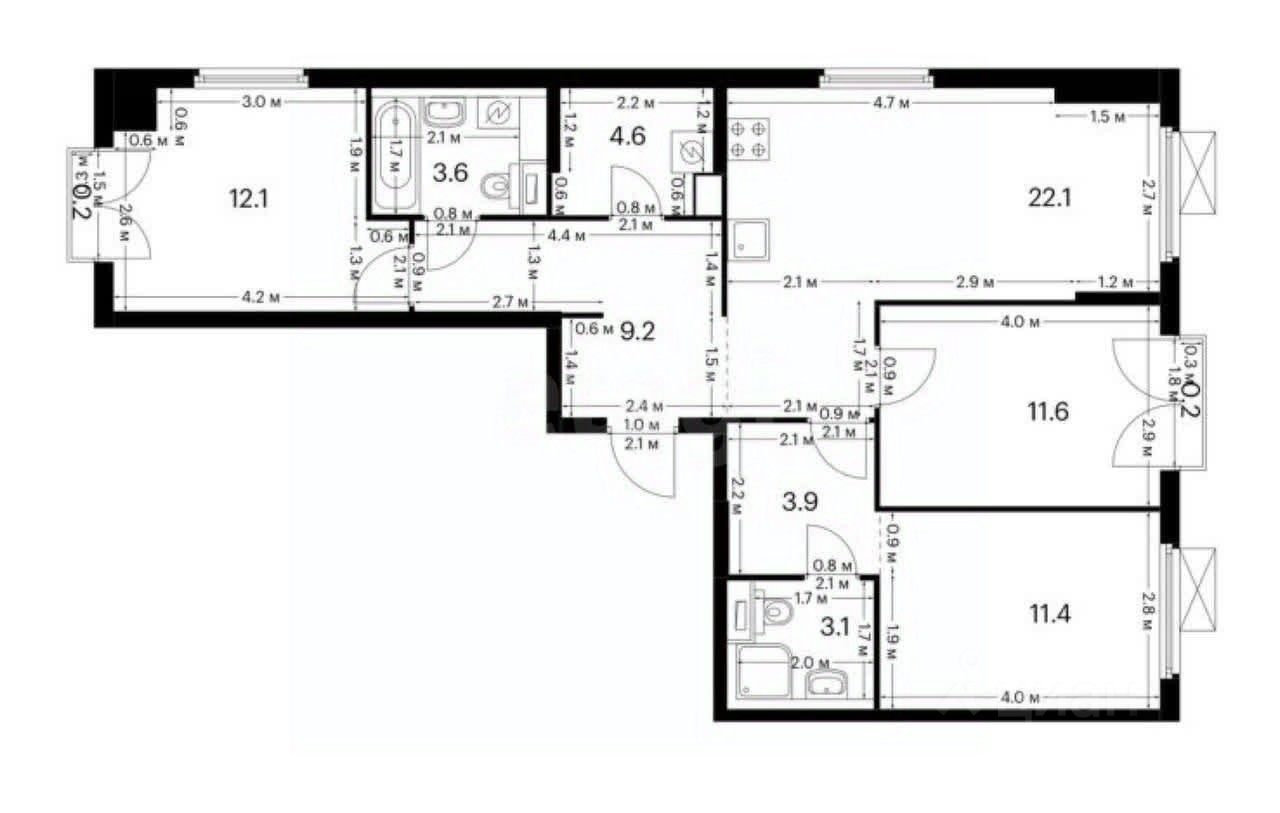 Квартира включает три отдельные спальни, каждая из которых достаточно большая для размещения двуспальной кровати и необходимых предметов мебели. В спальнях также могут быть предусмотрены встроенные шкафы для хранения вещей.