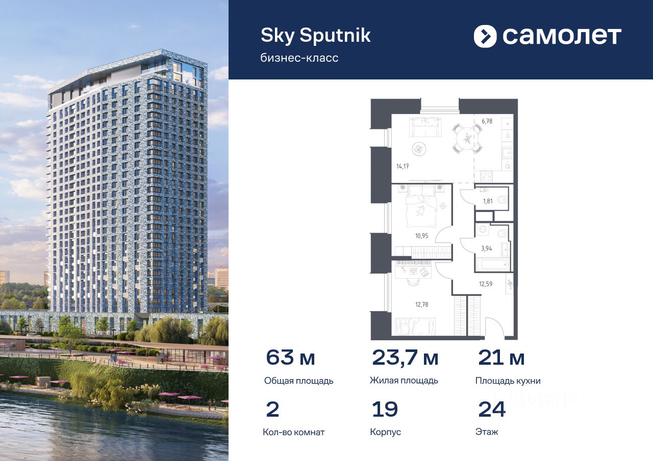 Предлагаются 2-комнатные апартаменты бизнес-класса 63,02 кв.м в корпусе 19 на 24 этаже, в Sky Sputnik Апартаменты без отделки. Доступность опции ''отделка'' и возможность комплектации мебелью и декором уточняйте у застройщика.