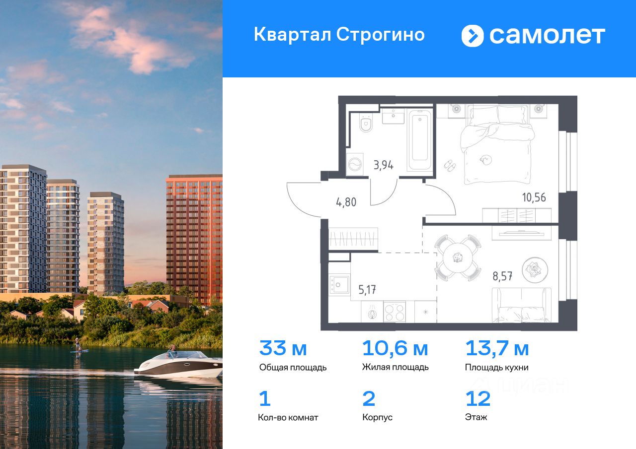 Предлагается 1-комнатная квартира комфорт-класса 33,04 кв.м в корпусе 2 на 12 этаже, в ЖК ''Квартал Строгино'' Квартира с чистовой отделкой. Доступность дополнительных опций уточняйте у застройщика.