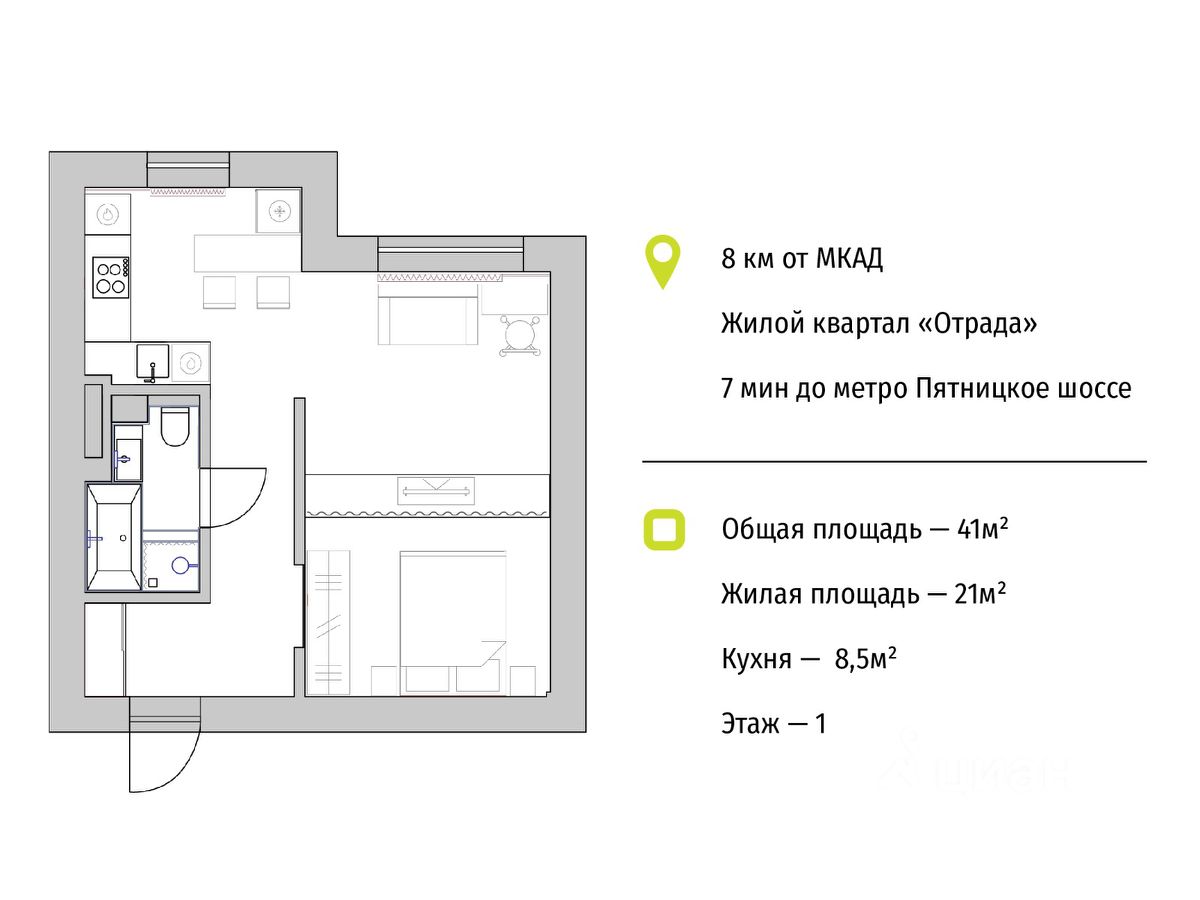 Общая площадь — 41 кв. м, жилая — 20 кв. м, кухня — 8 кв. м. Квартира расположена на первом этаже пятиэтажного дома. В квартире летом не жарко (не солнечная сторона, но за счет большого окна в гостиной светло и уютно), а зимой — не холодно. Высокий первый этаж + большие батареи.