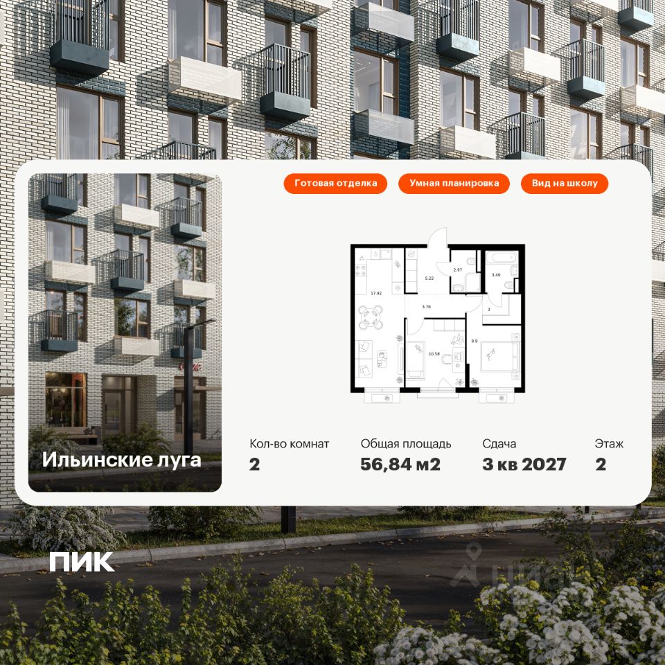 Продаётся 2-комн. квартира площадью 56,84 кв.м на 2 этаже 9 этажного дома (Корпус 4.1, Секция 5) проекта ПИК Ильинские луга. Светлый просторный подъезд на уровне земли, функциональная планировка, большие окна, c отделкой.
