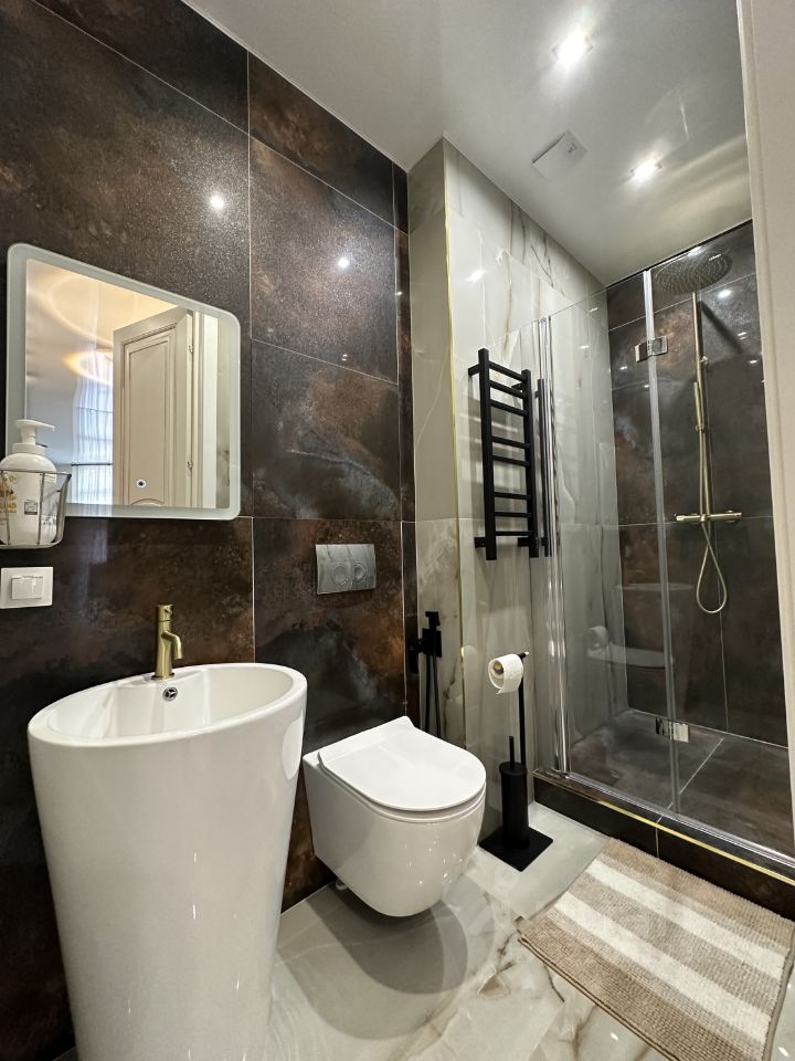 Подогрев полов в прихожей и с/у, широкоформатный керамогранит, паркетная доска. В каждой комнате установлены кондиционеры.