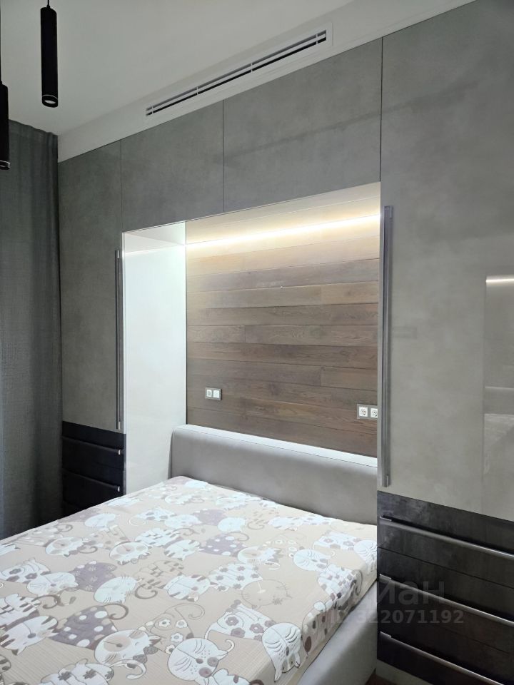 В спальне полноценная двухспальная кровать с подъемным механизмом и качественным матрасом, вокруг кровати вместительный шкаф для хранения вещей.