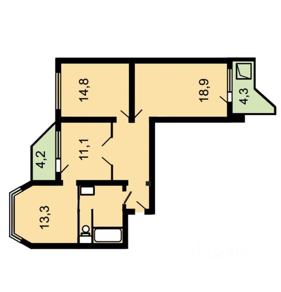 В квартире большая кухня, две изолированные комнаты, совмещенный санузел, просторная прихожая, проходная комната в кухню и две большие лоджии.
