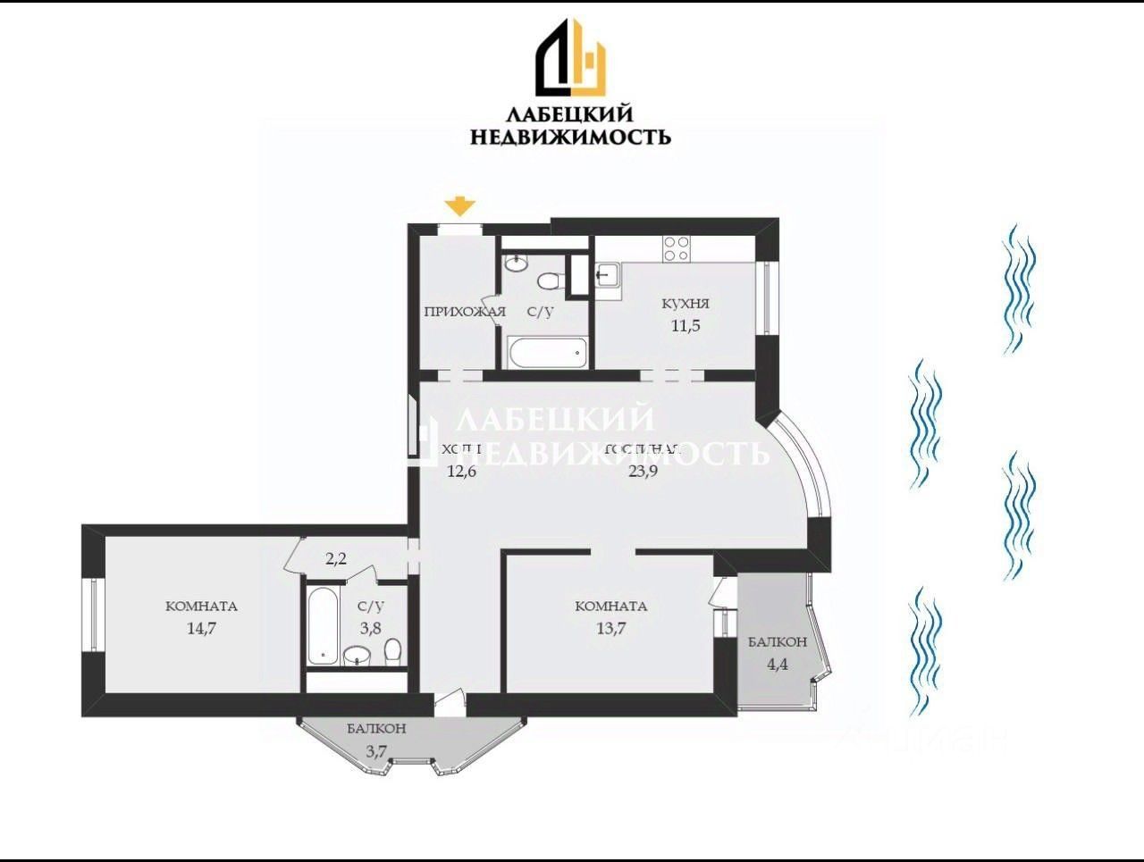 ПРО КВАРТИРУ: Квартира с ПРЕКРАСНЫМ ВИДОМ НА НАБЕРЕЖНУЮ, отличной планировкой, ДВУМЯ САНУЗЛАМИ И ДВУМЯ БАЛКОНАМИ! Прихожая - 6 м² Кухня - 11.5 м² Гостиная - 31.9 м² Две спальни - 14.7 м² и 13.7м² Прихожая - 6 м² Балконы - 4.4 м² и 3.7 м² Санузлы - 3.8 м² и 4.8 м² Коридор 5 м²