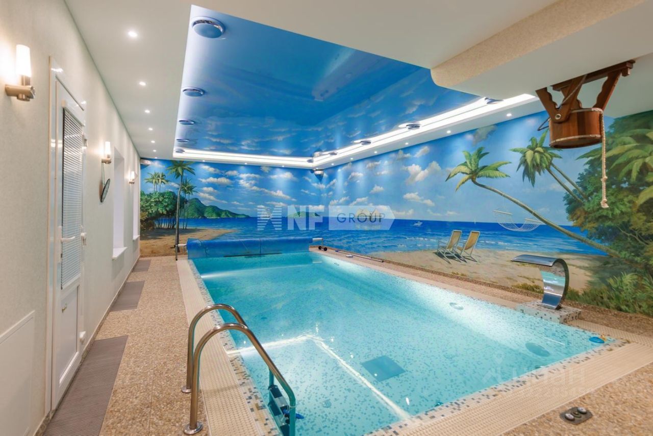 Отдельный СПА-комплекс 236 кв.м: 1 этаж: кухня, бассейн 9 м, душевая, сауна, с/у, зона отдыха с камином, 2 этаж: бильярдная.
