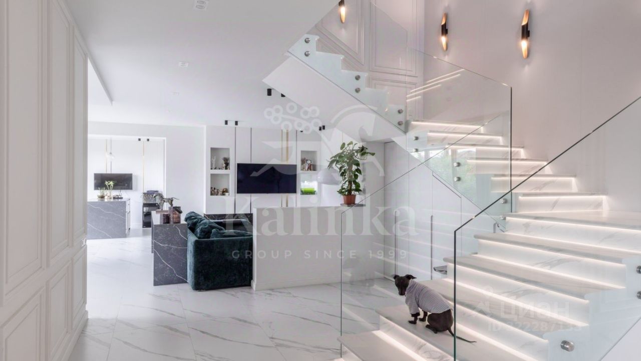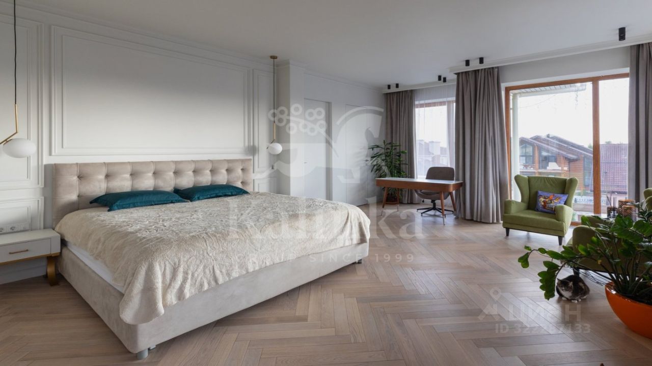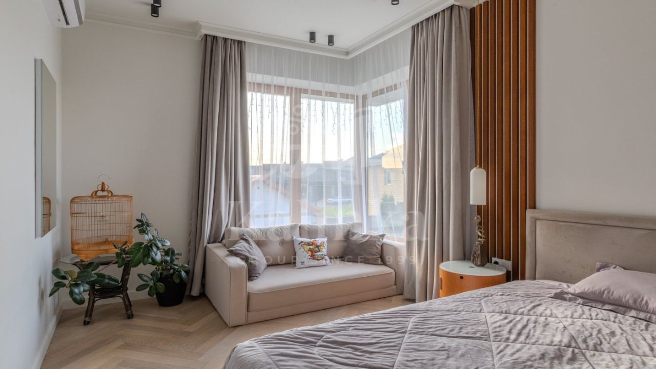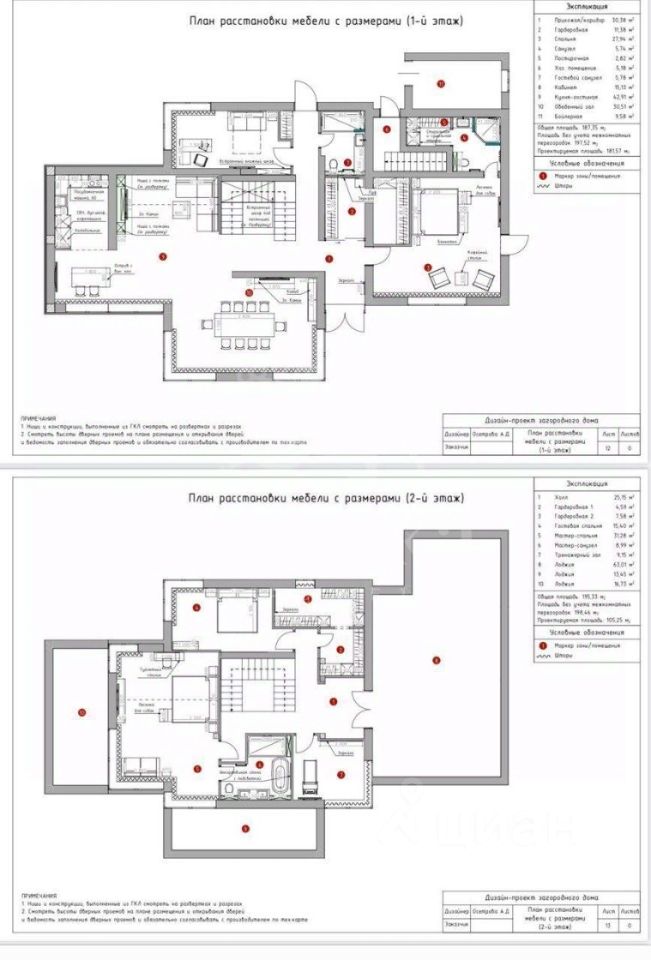 Планировка: 1 этаж: холл, гардеробная, спальня, санузел, постирочная, кабинет (можно использовать как спальню), кухня-столовая, гостиная, бойлерная. 2 этаж: холл, гостевая спальня, гардеробная, санузел, гардеробная, мастер-спальня с санузлом, тренажерный зал, три лоджии.