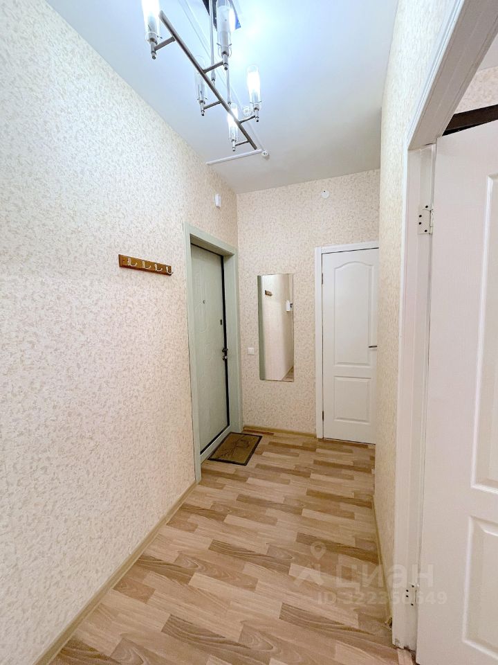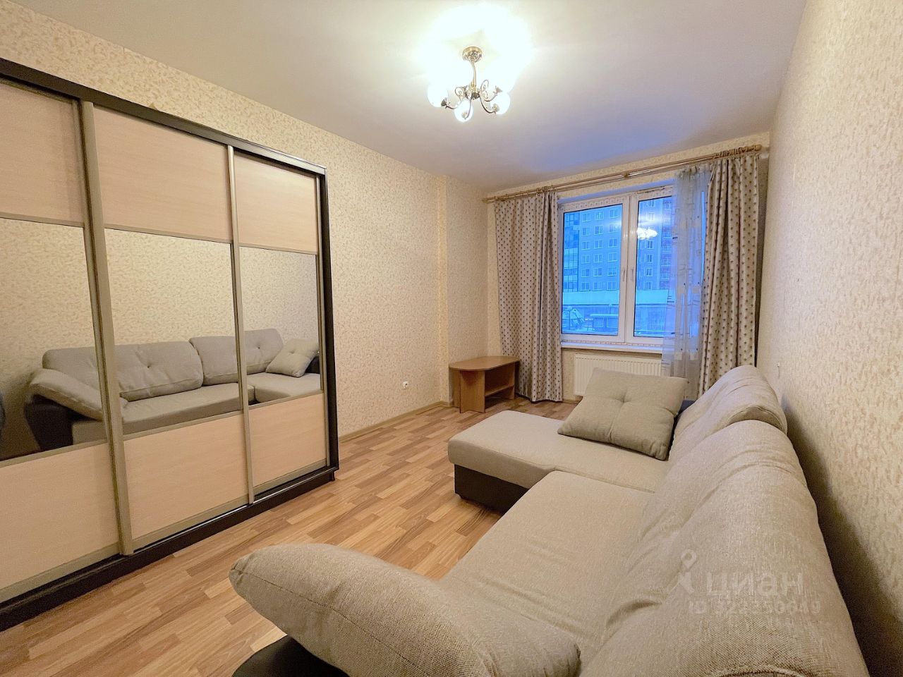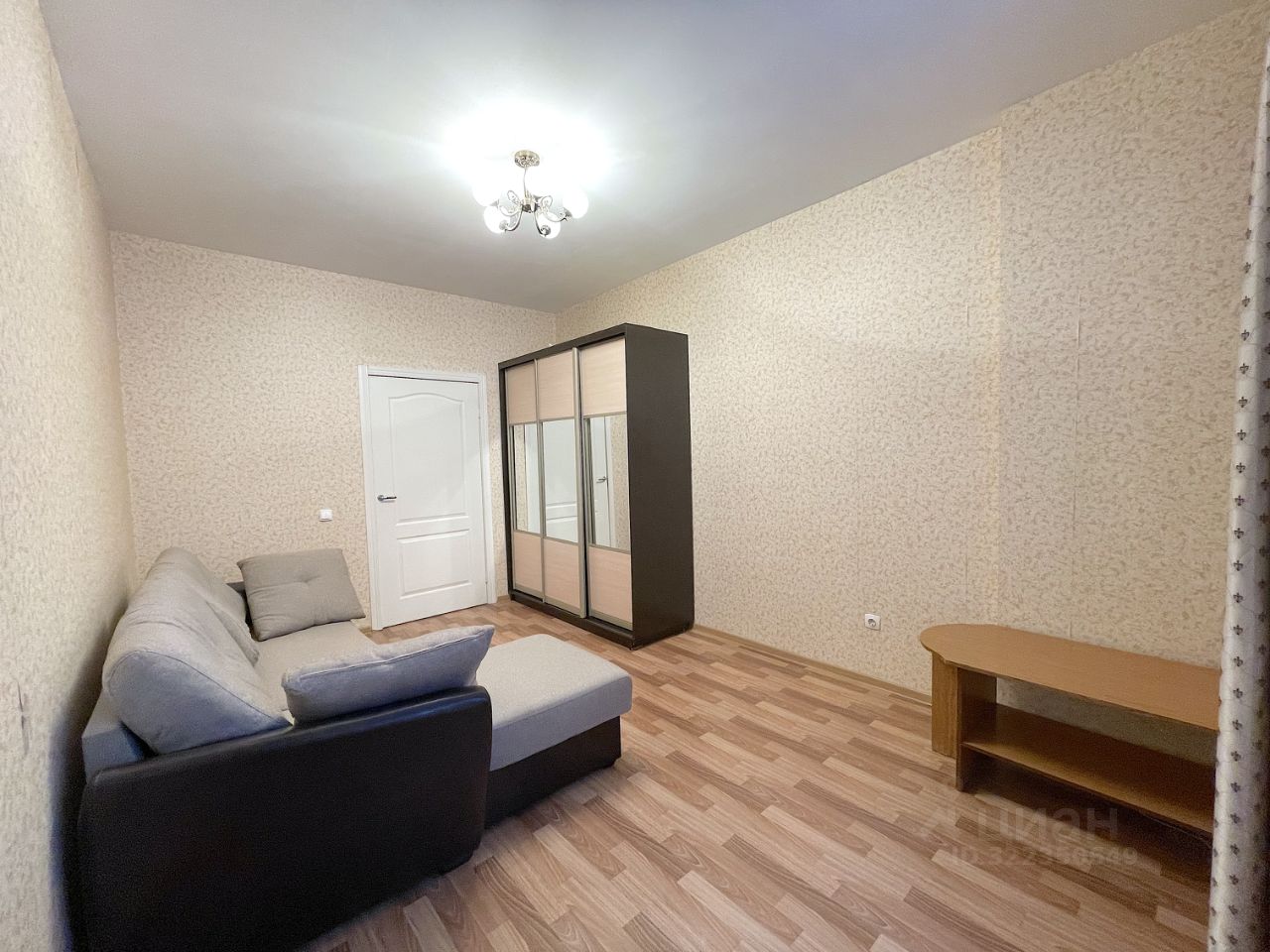 В комнате просторный раскладной диван, стол и зеркальный большой шкаф. В прихожей зеркало и крючки для верхней одежды. Также в квартире есть место для вашей мебели.