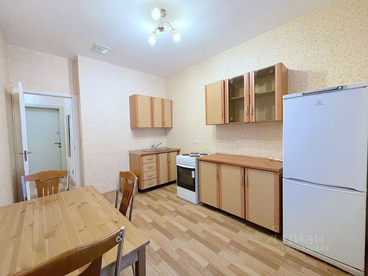 На кухне есть небольшой гарнитур, стол, стулья. Большой холодильник с морозильной камерой. Стиральная машина.