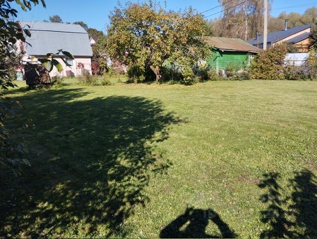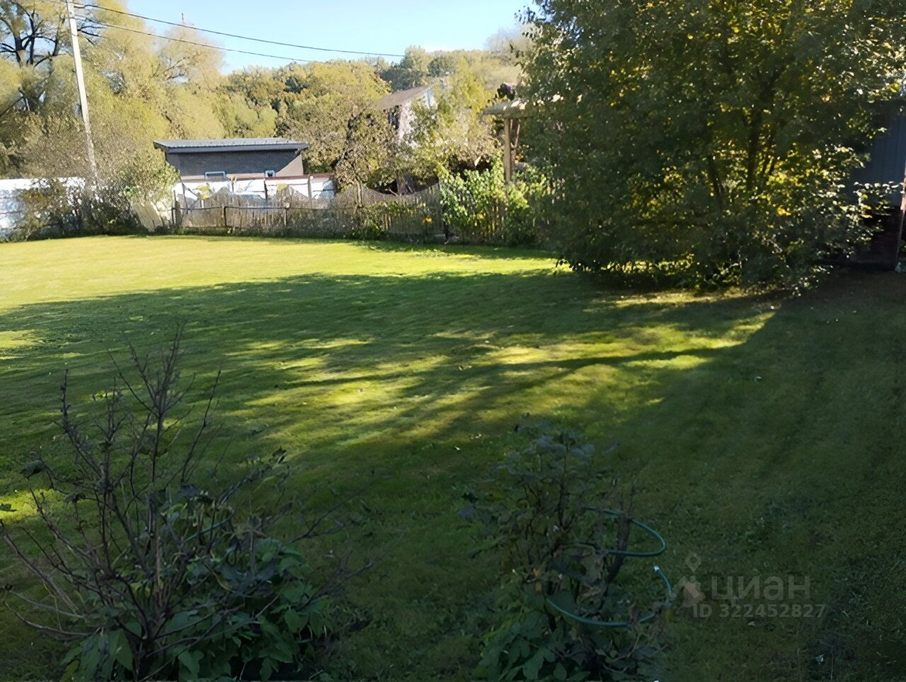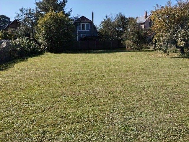 Участок прямоугольной формы, ровный, с растущими на нем фруктовыми деревьями и газонной травой. Огорожен забором.