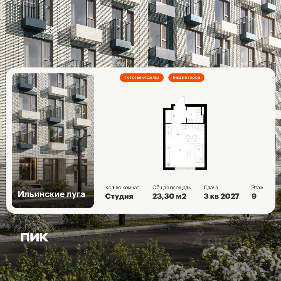 Продаётся квартира-студия площадью 23,3 кв.м на 9 этаже 9 этажного дома (Корпус 3.3, Секция 5) проекта ПИК Ильинские луга. Светлый просторный подъезд на уровне земли, функциональная планировка, большие окна, c отделкой.