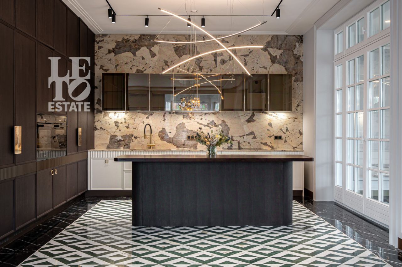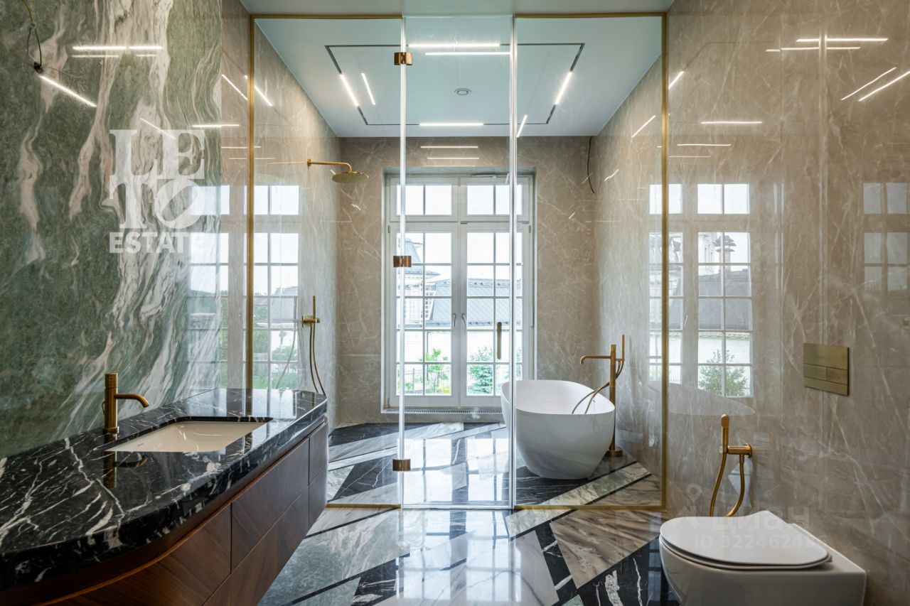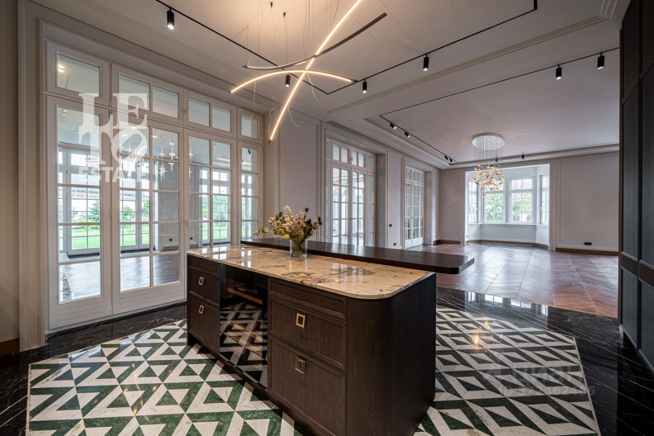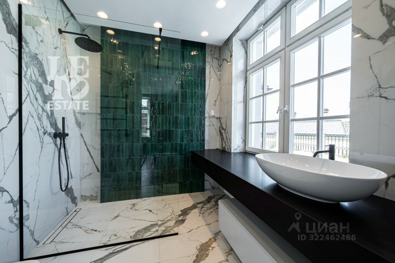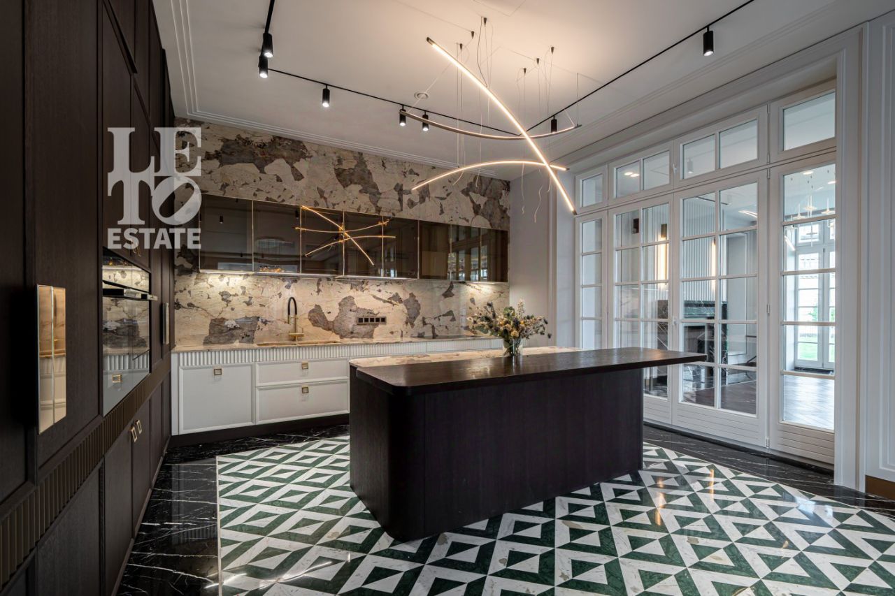 Фасад дома выполнен в лучших традициях английской классики, а к нему примыкает просторный гараж на четыре машиноместа. Для отдыха и приема гостей предусмотрены две роскошные террасы площадью 75 и 60 кв. м, а также уютная зона барбекю с обеденной группой.