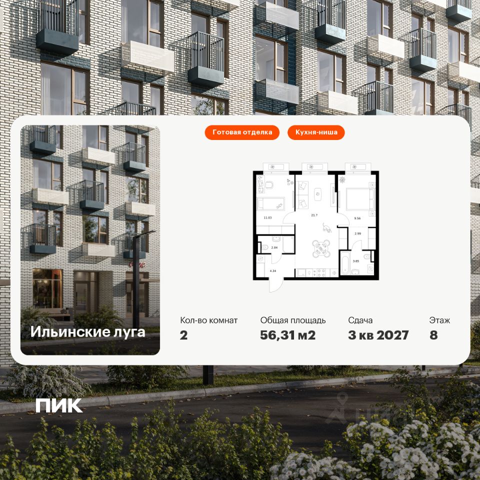 Продаётся 2-комн. квартира площадью 56,31 кв.м на 8 этаже 9 этажного дома (Корпус 4.1, Секция 3) проекта ПИК Ильинские луга. Светлый просторный подъезд на уровне земли, функциональная планировка, большие окна, c отделкой.
