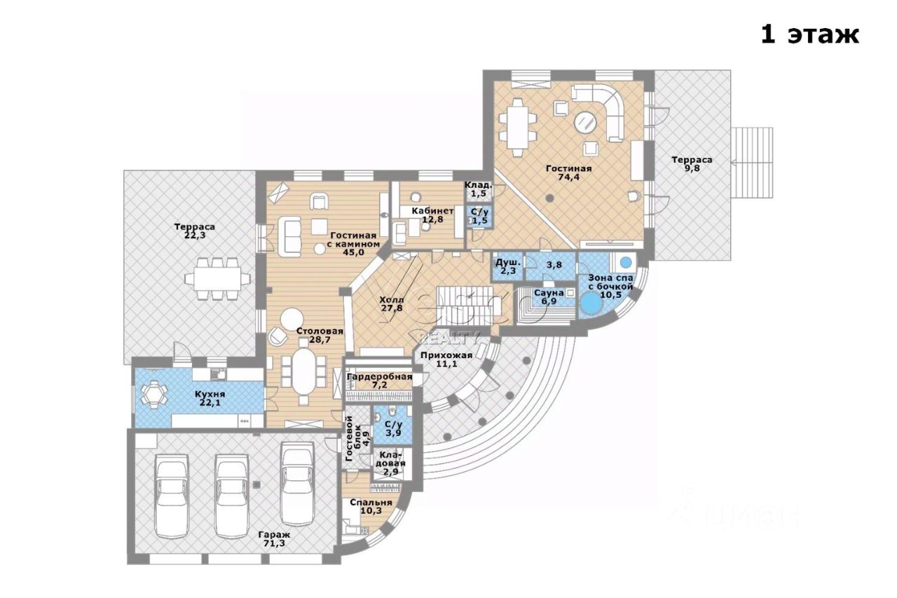 1 этаж: Общие помещения: прихожая (11,1), гардеробная (7,2), холл (28), каминный зал (45), столовая (29), кухня (22,1) с выходом на террасу (22,3), гостиная (74,4) с выходом на террасу (9,8), кабинет (12,8) с кладовой (1,5), гостевой с/у (1,5), зона спа с бочкой (10,5), сауна (6,9) с душевой (2,3), гараж на 3 м/м (71,3). Спальни: гостевой блок со спальней (10,3), санузлом (3,9), кладовой (2,9) и гардеробной (4,9).