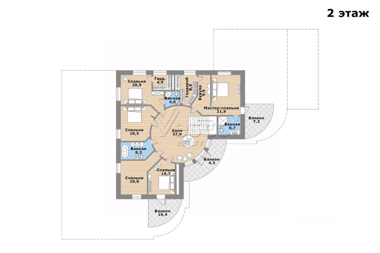2 этаж: Общие помещения: холл (38), балкон (4). Мастер-спальня (22) с будуаром (10), гардеробной (9), ванной комнатой (7) и балконом (7). Спальня (21) с гардеробной (5) и ванной комнатой (4). Детские (19 и 20), детская (15) с балконом (10), общая ванная (9).