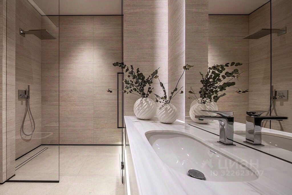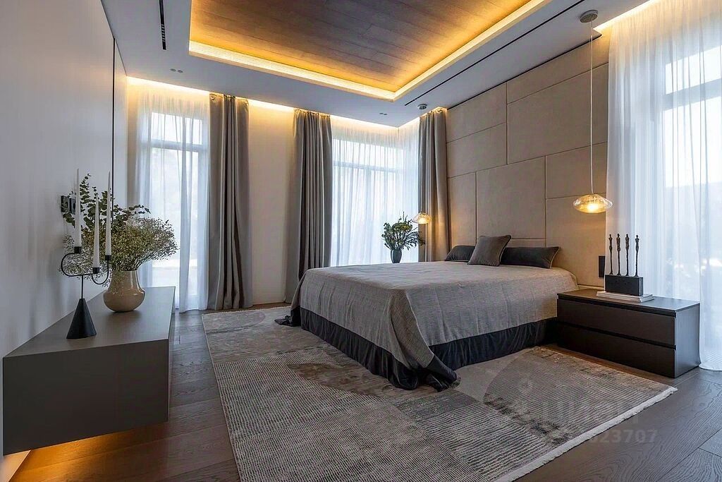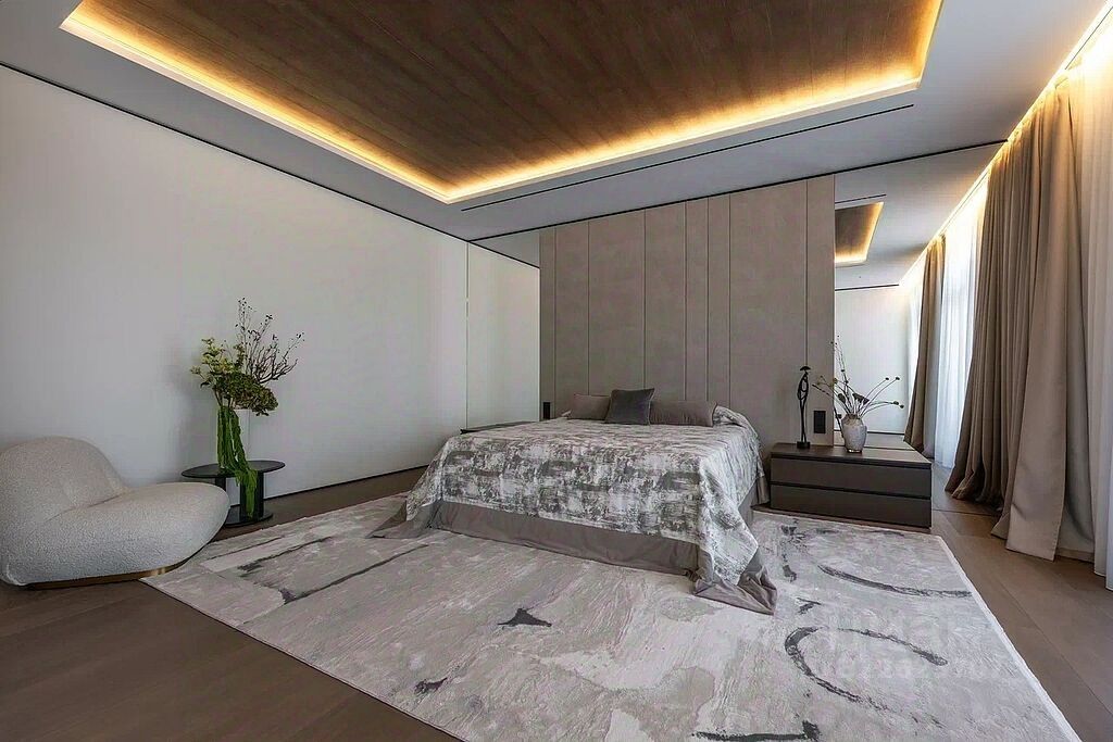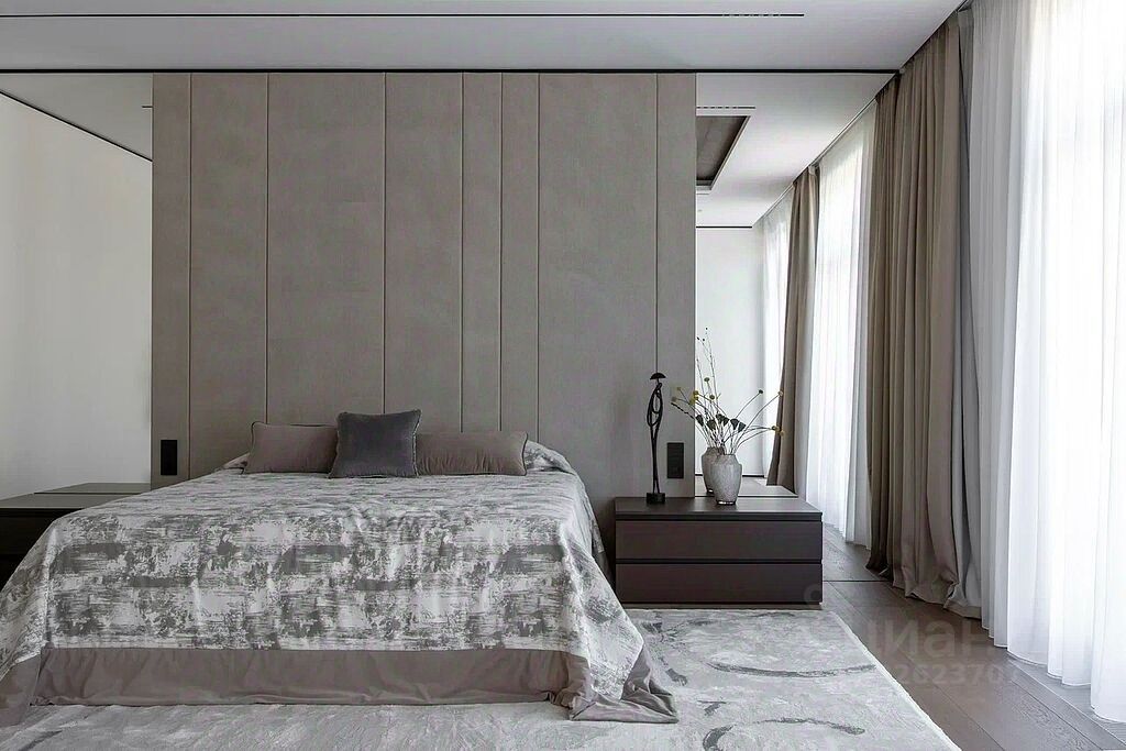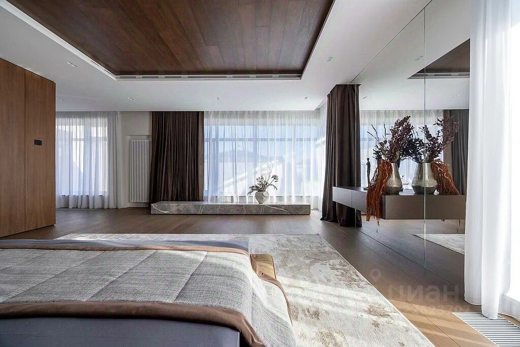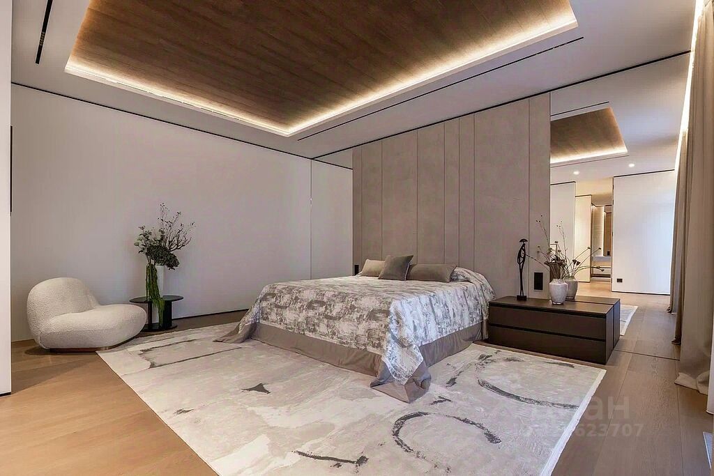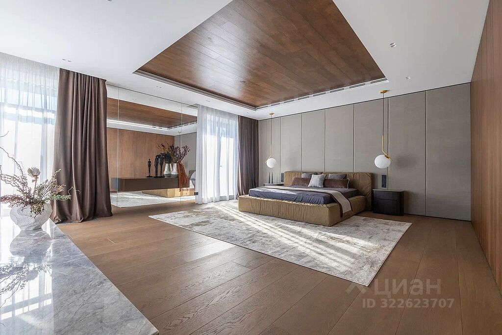Мастер блок: спальня, большая ванная, две гардеробных, терраса, вторая мастер-спальня с ванной комнатой, гардеробной и террасой. Детский блок: 2 зеркальных спальни, каждая со своим санузлом, и большая гардеробная 25 кв.м.