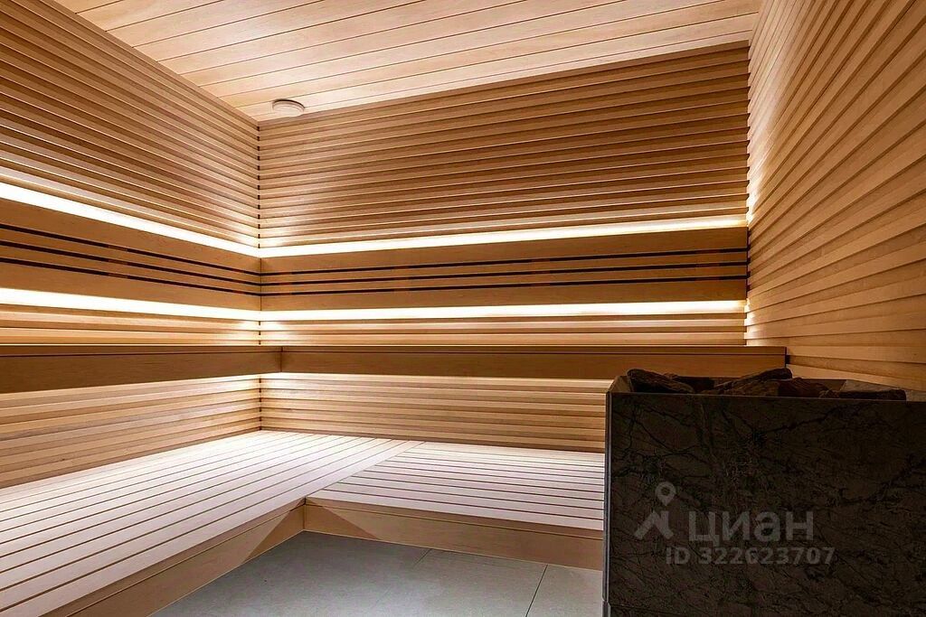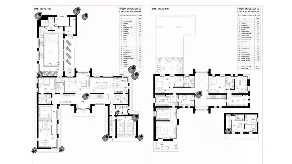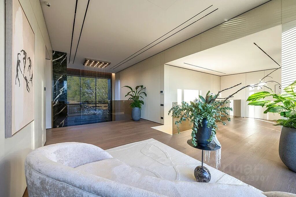 Столовая с панорамными окнами и выходом на террасу. Просторная кухня с комнатой для хранения. Каминный зал и второй свет. Изолированный от внешнего шума рабочий блок - кабинет со своим санузлом и просторной сезонной гардеробной. Гостевая спальня с с/у, гардеробная, гараж на 2 машиноместа, котельная, постирочная. Блок для персонала с отдельным входом, санузлом, кухней и 2-мя спальнями. СПА с бассейном, сауной и хаммамом.