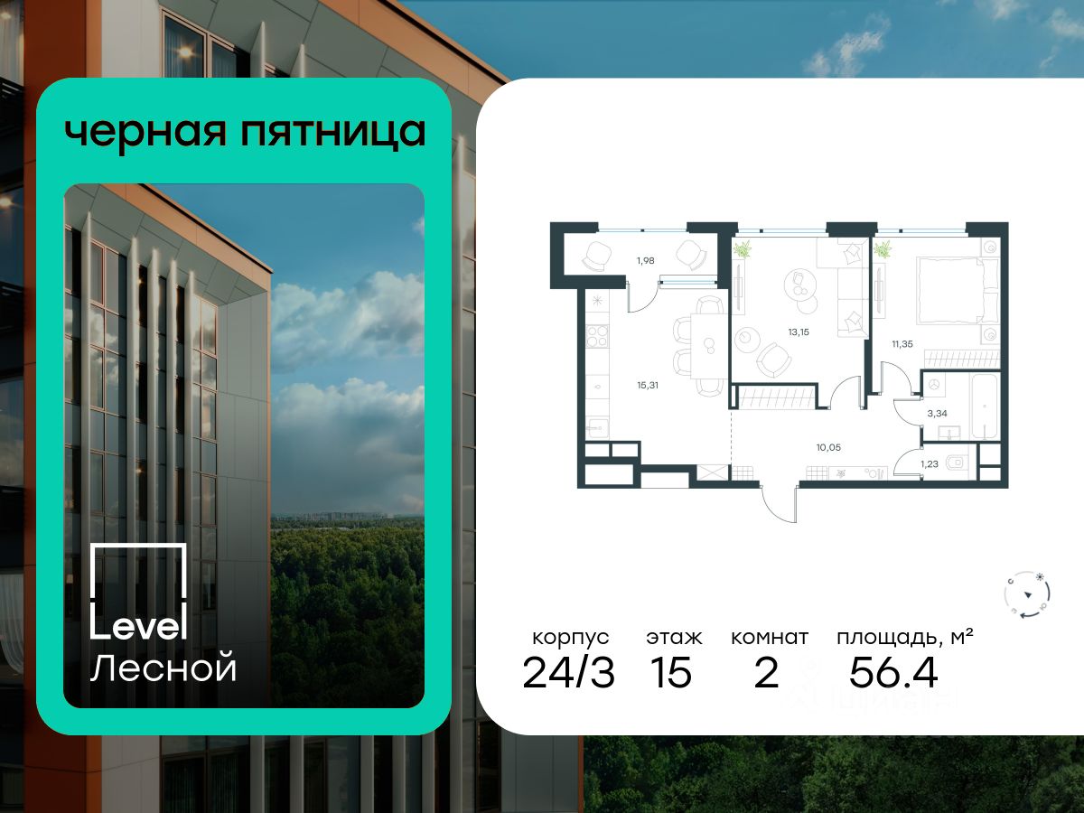 В районе, утопающем в густой зелени лесов, многочисленных парков и скверов, продаётся 2-комнатная квартира площадью 56.40 кв.м с отделкой white box. Квартира расположена на 15 этаже в жилом комплексе комфорт-класса Level Лесной (компания Level Group/Левел групп).