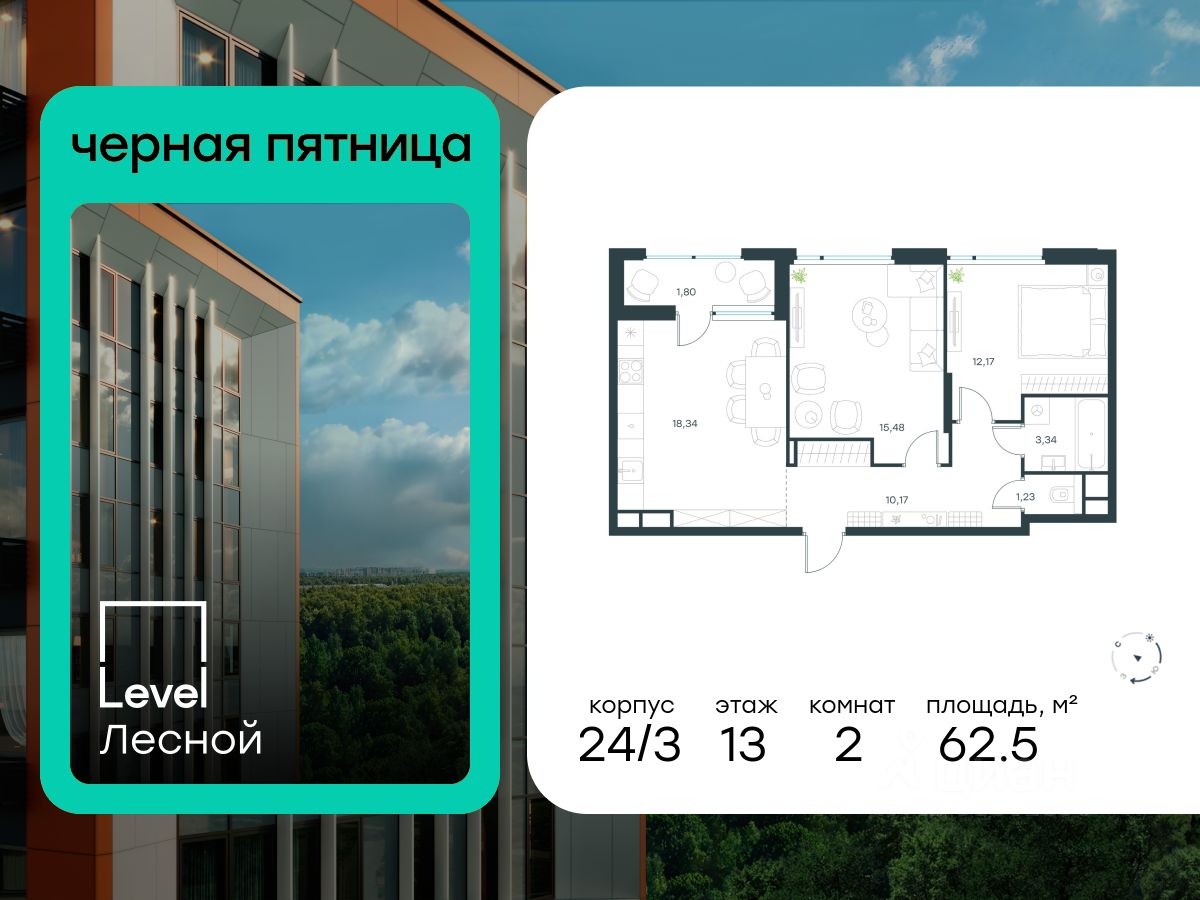 В районе, утопающем в густой зелени лесов, многочисленных парков и скверов, продаётся 2-комнатная квартира площадью 62.50 кв.м с отделкой white box. Квартира расположена на 13 этаже в жилом комплексе комфорт-класса Level Лесной (компания Level Group/Левел групп).