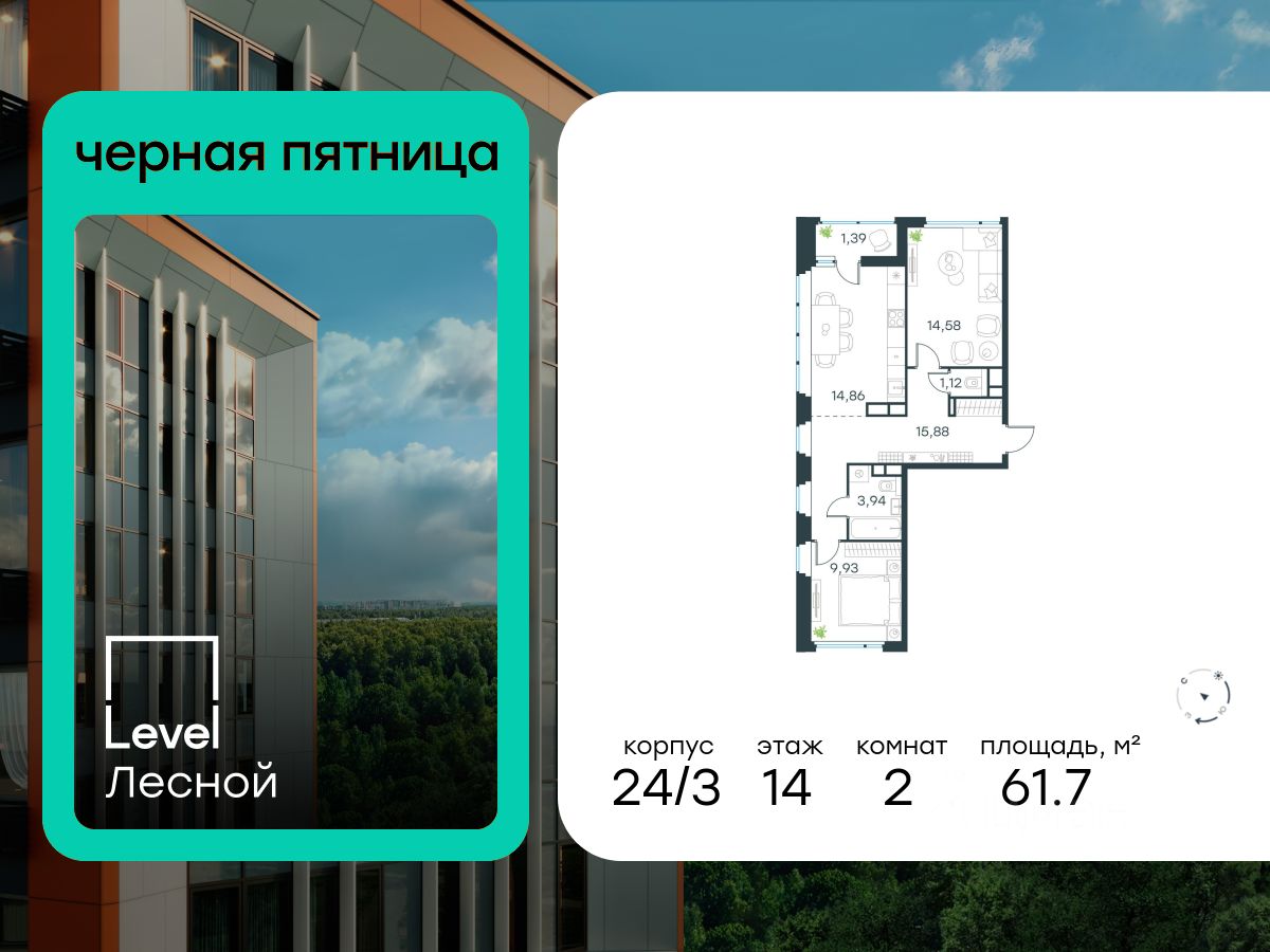 В районе, утопающем в густой зелени лесов, многочисленных парков и скверов, продаётся 2-комнатная квартира площадью 61.70 кв.м с отделкой white box. Квартира расположена на 14 этаже в жилом комплексе комфорт-класса Level Лесной (компания Level Group/Левел групп).