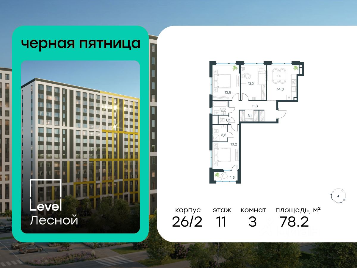 В районе, утопающем в густой зелени лесов, многочисленных парков и скверов, продаётся 3-комнатная квартира площадью 78.20 кв.м без отделки. Квартира расположена на 11 этаже в жилом комплексе комфорт-класса Level Лесной (компания Level Group/Левел групп).