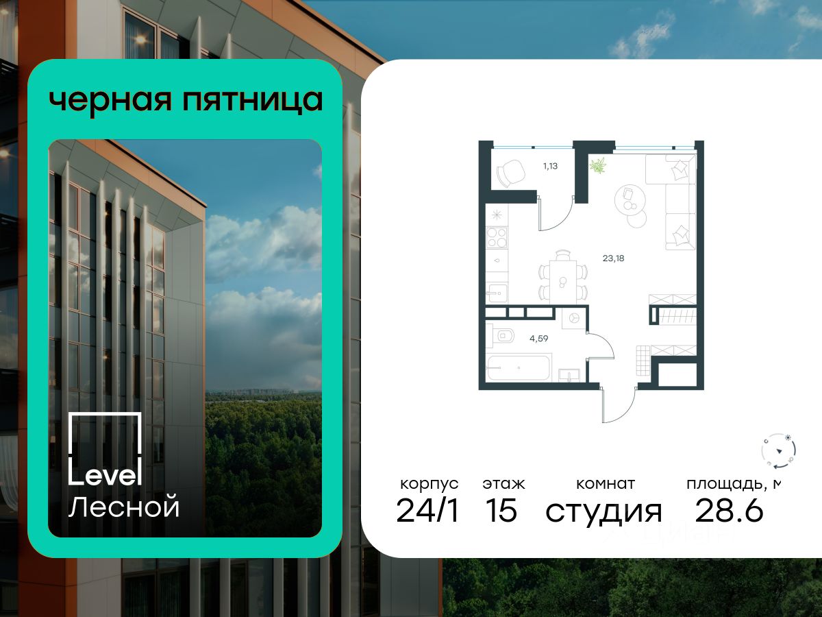 продам 1-к, Левел Лесной ЖК, 24/18 125 299 ₽