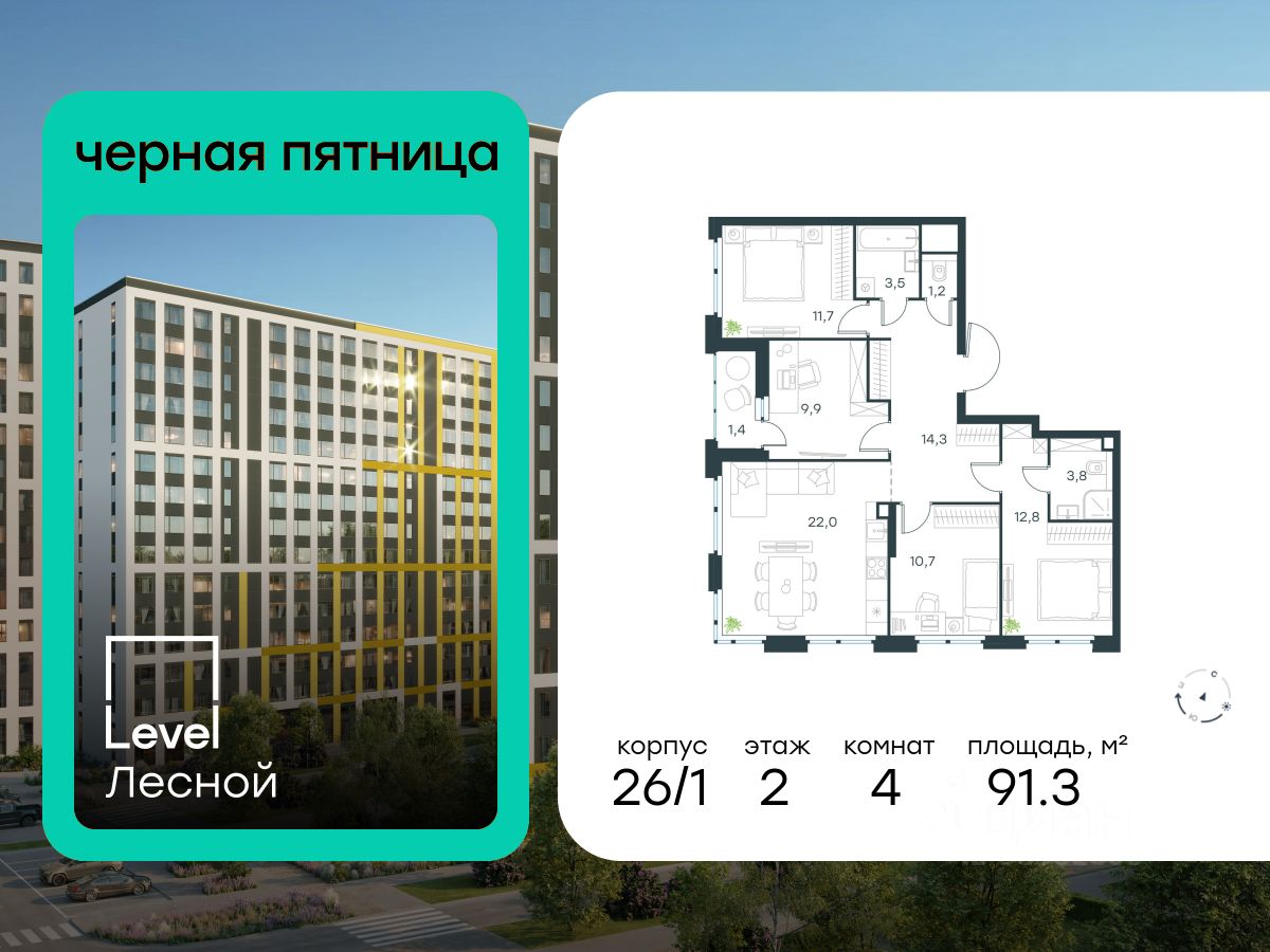 В районе, утопающем в густой зелени лесов, многочисленных парков и скверов, продаётся 4-комнатная квартира площадью 91.30 кв.м с отделкой white box. Квартира расположена на 2 этаже в жилом комплексе комфорт-класса Level Лесной (компания Level Group/Левел групп).
