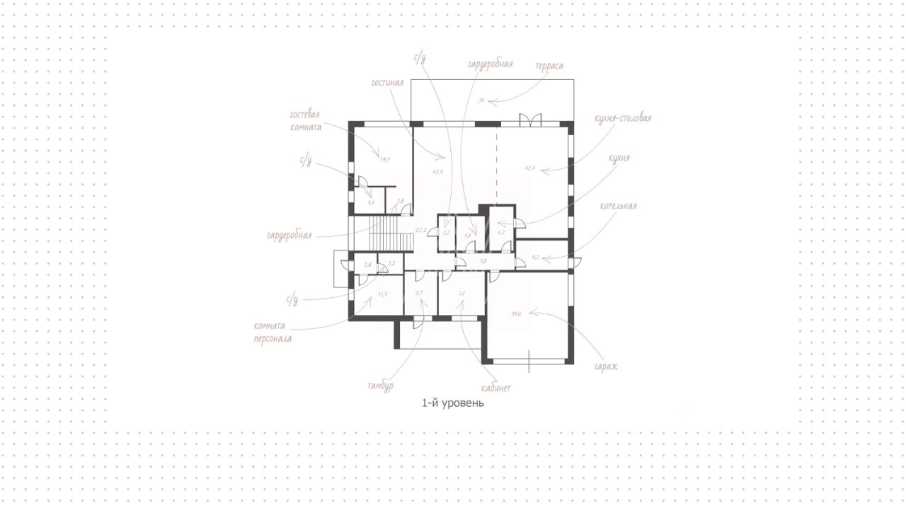 Планировка продумана до деталей: На первом этаже — просторный холл, кабинет, спальня с собственным санузлом, гостиная с камином и выходом на террасу, объединённая с кухней-столовой. Отдельно предусмотрена рабочая кухня, гардеробная, бойлерная и гостевой санузел. Гараж на 2 автомобиля. Для персонала предусмотрен отдельный вход в свой блок.