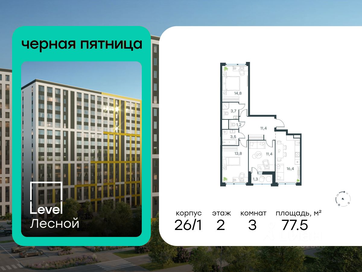 В районе, утопающем в густой зелени лесов, многочисленных парков и скверов, продаётся 3-комнатная квартира площадью 77.50 кв.м с отделкой white box. Квартира расположена на 2 этаже в жилом комплексе комфорт-класса Level Лесной (компания Level Group/Левел групп).