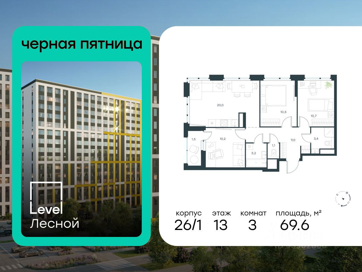 В районе, утопающем в густой зелени лесов, многочисленных парков и скверов, продаётся 3-комнатная квартира площадью 69.60 кв.м с отделкой white box. Квартира расположена на 13 этаже в жилом комплексе комфорт-класса Level Лесной (компания Level Group/Левел групп).