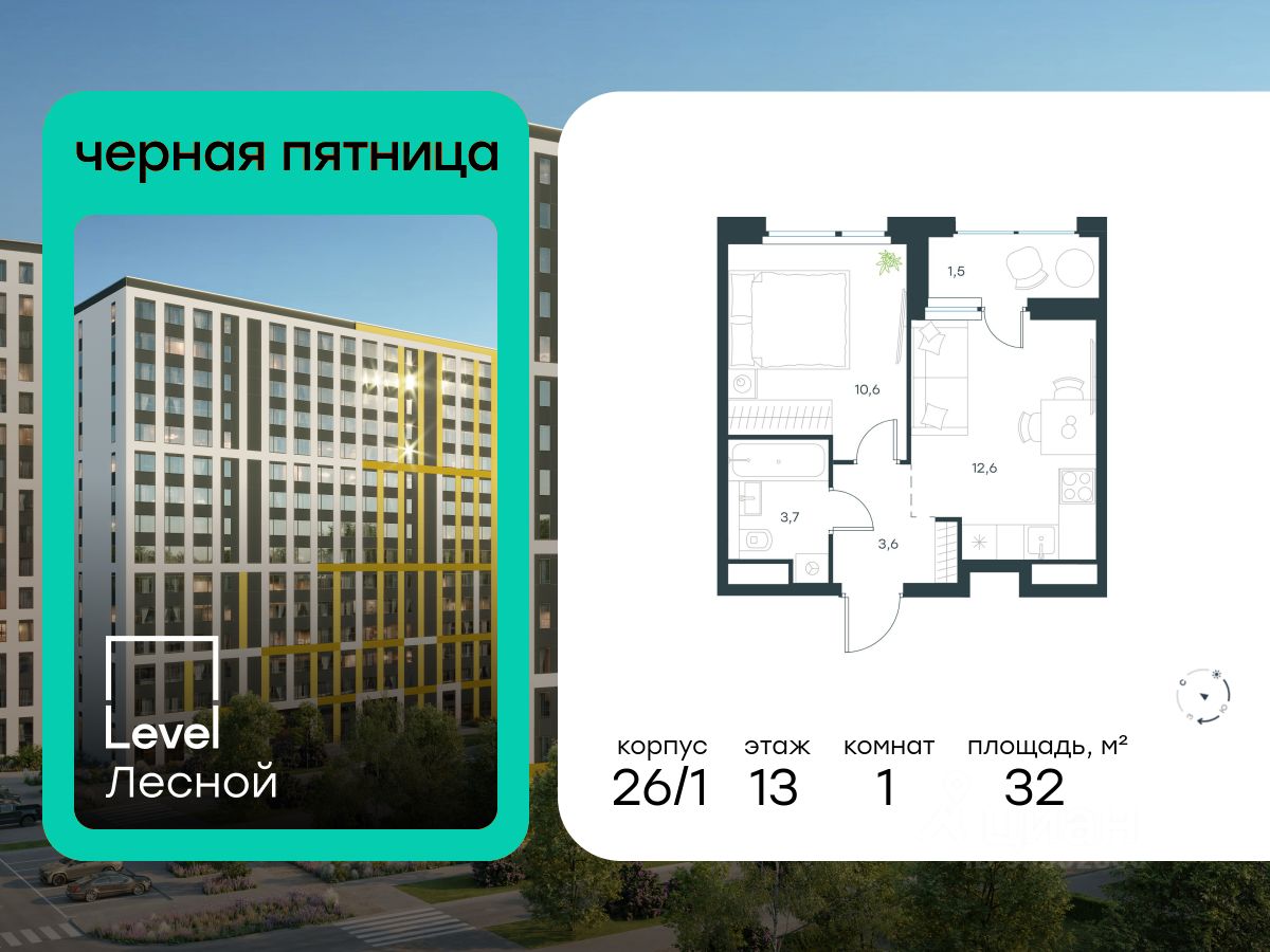 В районе, утопающем в густой зелени лесов, многочисленных парков и скверов, продаётся 1-комнатная квартира площадью 32.00 кв.м с отделкой white box. Квартира расположена на 13 этаже в жилом комплексе комфорт-класса Level Лесной (компания Level Group/Левел групп).