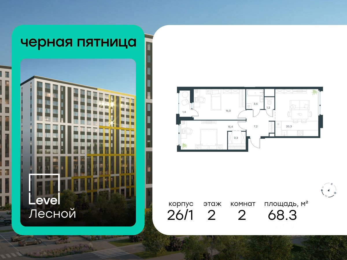 В районе, утопающем в густой зелени лесов, многочисленных парков и скверов, продаётся 2-комнатная квартира площадью 68.30 кв.м с отделкой white box. Квартира расположена на 2 этаже в жилом комплексе комфорт-класса Level Лесной (компания Level Group/Левел групп).
