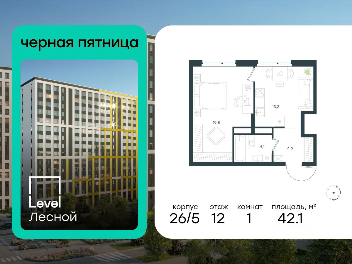 В районе, утопающем в густой зелени лесов, многочисленных парков и скверов, продаётся 1-комнатная квартира площадью 42.10 кв.м с отделкой white box. Квартира расположена на 12 этаже в жилом комплексе комфорт-класса Level Лесной (компания Level Group/Левел групп).