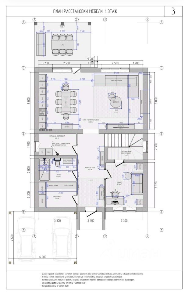 На первом этаже: * Объединённое пространство кухни-гостиной (46 кв. м) * Крытая веранда (19,85 кв. м) * Котельная-постирочная (6,34 кв. м) * Прихожая-холл (15,53 кв. м) * Санузел (6,6 кв.