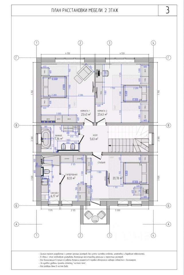 На втором этаже: * Мастер-спальня (20,78 кв. м) с гардеробной (8,33 кв. м), собственным санузлом (6,17 кв. м) и выходом на террасу * Холл (5,63 кв. м) * Две спальни (23,43 кв. м) * Ванная комната (7,36 кв. м)